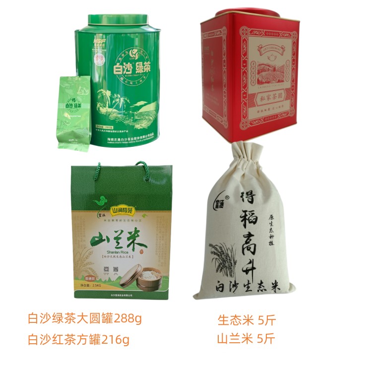 白沙绿茶大圆罐288g+白沙红茶方罐216g+山兰米礼盒5斤+生态米5斤