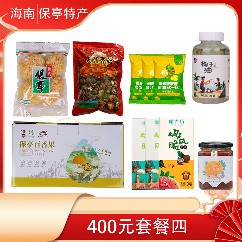 套餐包含:百香果中果5斤装*1件+一品椰子油 750ml*1瓶+椰风脆饼90g*3盒+惠民百花蜜500g*1瓶+菠萝蜜冻干(零食)35g*3袋+香菇400g*1袋+银耳160g*1包