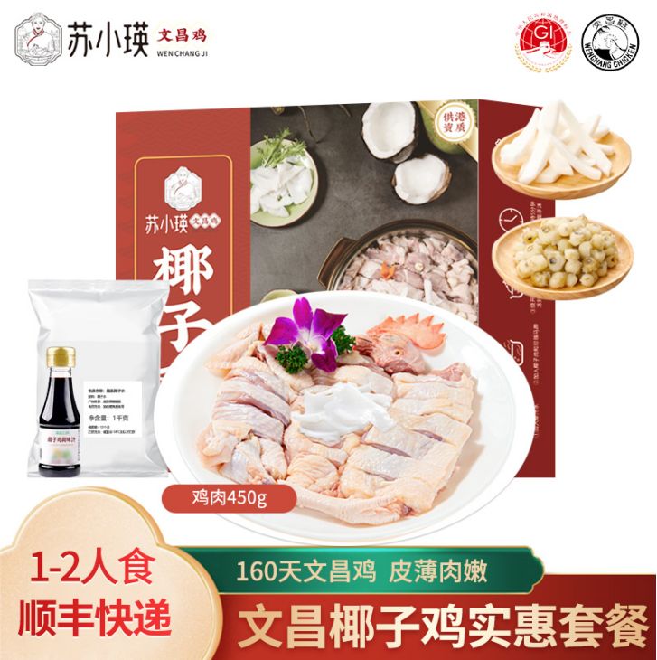 3、永基苏小瑛椰子鸡 鸡肉切块450g;棷肉100g;马蹄100g;椰子水1L;酱油调味150g(酱油、沙姜、金桔汁);辣椒包20g*1包