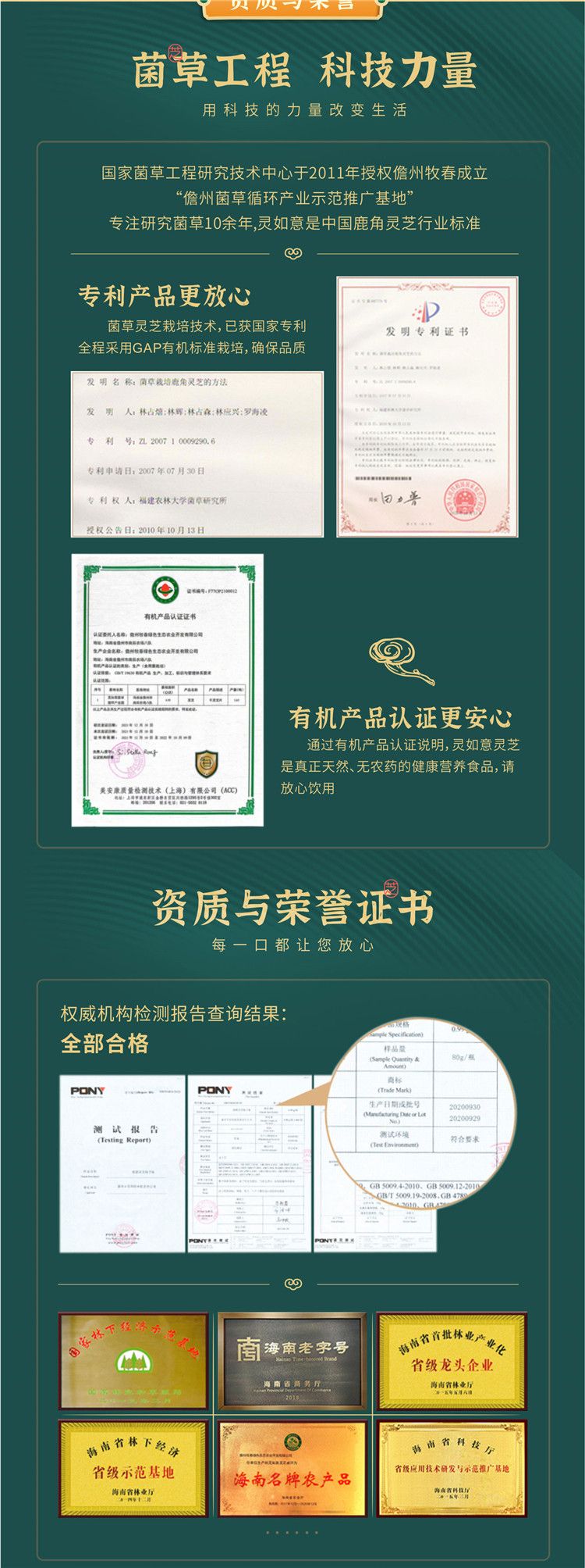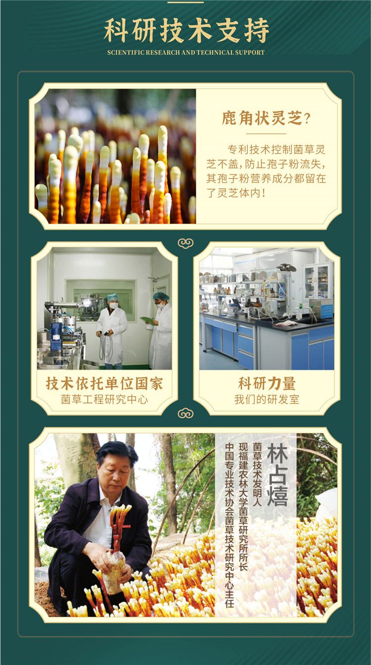 菌草鹿角灵芝是采用我们的自己种植的菌草为原料并采用GAP有机标准及专利技术栽培灵芝,生产加工全过程无污染。经过美国密西根州周立大学,北京大学医学部,广州医学部上海第二军医大学、福建农林大学菌草研究所和日本食品分析中心所等相关科研机构研究证明:菌草栽培出来的灵芝无论是灵芝多糖还是灵芝三萜的含量都比普通的椴木灵芝或者野生灵芝高出许多。