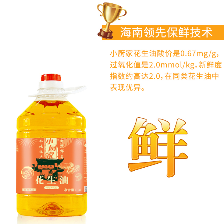 思香源秉承 “生态·健康·环保”的品牌理念,用心甄选 100% 选取海南本地新鲜当季的花生为原材料,研发了小厨家系列食用油,该系列食用油荣获海南省著名商标产品。小厨家小粒种花生油采用传统小榨工艺,在本土生产区加工锁鲜,道道检测,杜绝黄曲霉素,化学物质 0 添加。