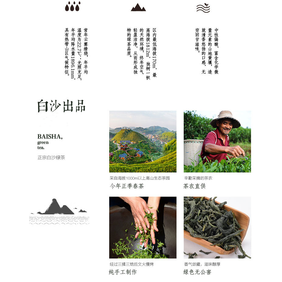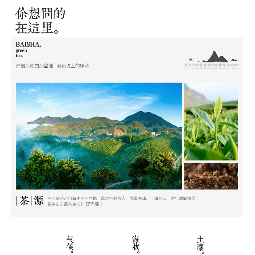 白沙绿茶,海南省 白沙黎族自治县 境内的 国营白沙农场 特产,中国国家地理标志产品。因海南中部适宜的气候与 白沙陨石坑地区独特的土壤条件,品质优良,营养成分高,市场反映良好,远销香港、台湾以及东南亚国家。白沙绿茶主要采摘海南和云南大叶、 奇兰 、福鼎、水仙、 福云6号 等茶树嫩度、净度、新鲜度一致符合规定标准的鲜叶为原料,采用精湛的传统工艺制作而成。其外形条索紧结、匀整、无梗杂、色泽绿润有光,香气清高持久,汤色黄绿明亮,叶底细嫩匀净,滋味浓醇鲜爽,饮后回甘留芳,连续冲泡品茗时具有“一开味淡二开吐,三开四开味正浓,五开六开味减”的耐冲泡性。