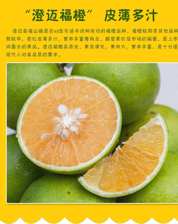 福橙,澄迈,2003年从广东引进并培育成功、具有比较有名常见地方特色,热带橙类作物。其明显特征,:果大、皮簿、汁多、硒含量高、味道和滋味甜酸、特别适口。澄迈,福橙又称为黄福橙,起源于中国,15世纪传入欧洲和美洲。澄迈,多年成长,灌木,它重要,优质,品质优,果皮清化,果肉大,营养丰富,,十分适合现代人对高品质,需求。“澄迈福橙”因特有的优良品质,先后被国家有关部门评为“中国十大名橙”“中国国宴特供果品”“全国最具特色产品”,澄迈县被授予“中国福橙之乡”。2016年和2018年先后荣获第十四届、第十六届中国国际农产品交易会参展农产品“金奖”。
