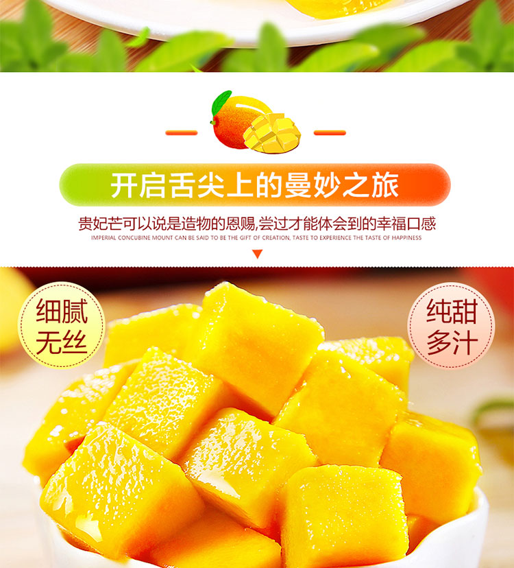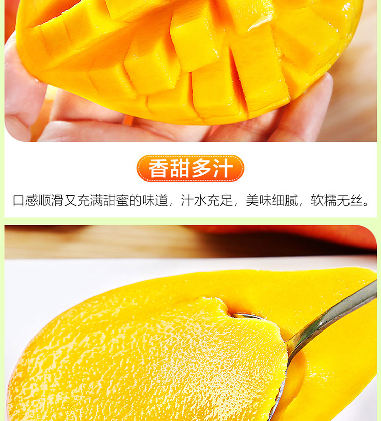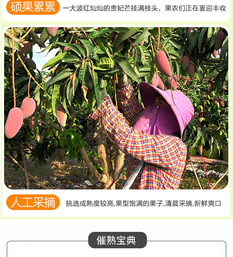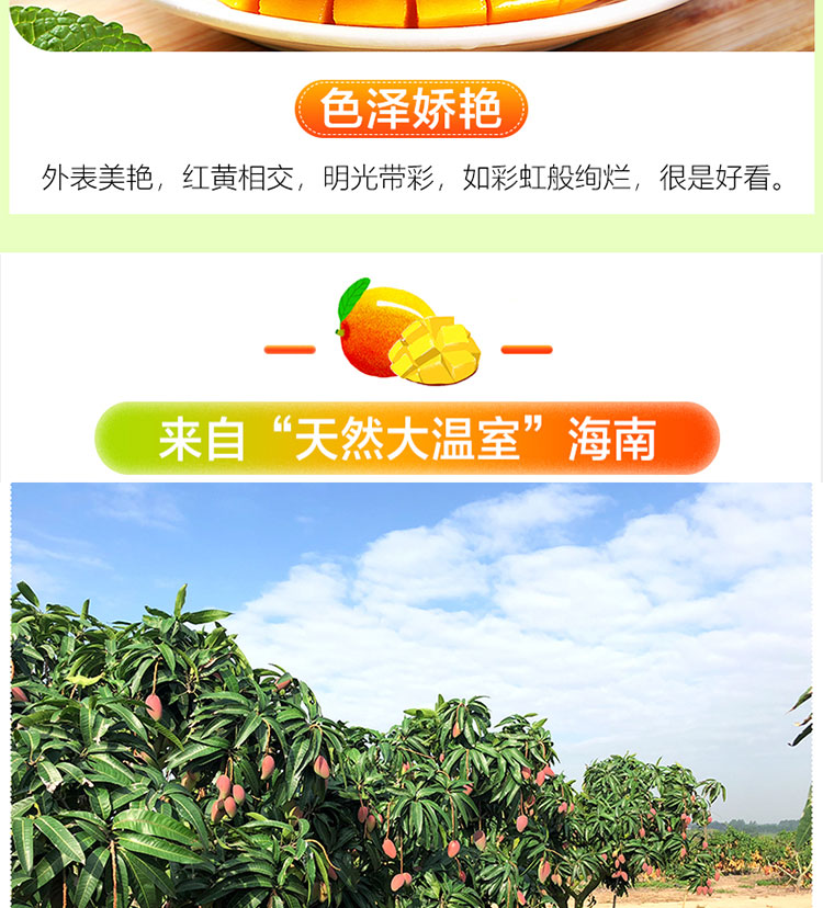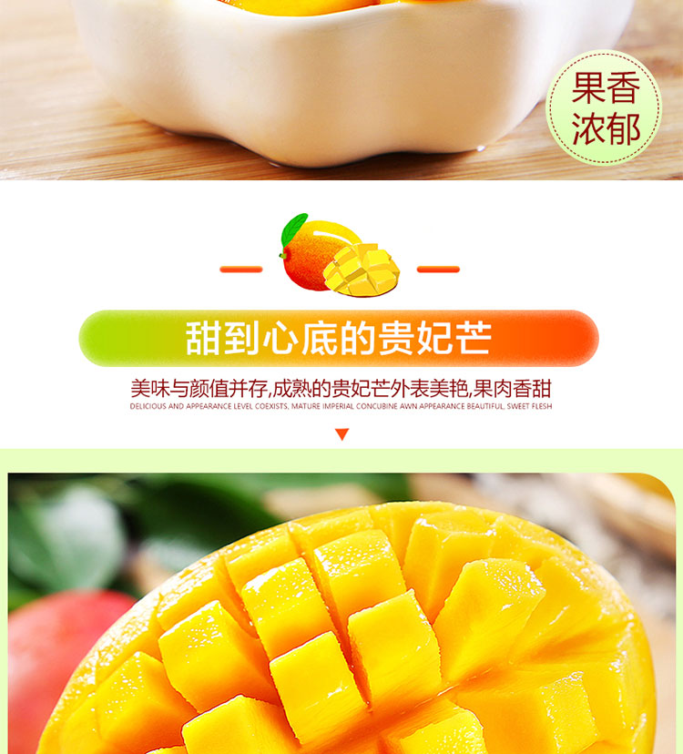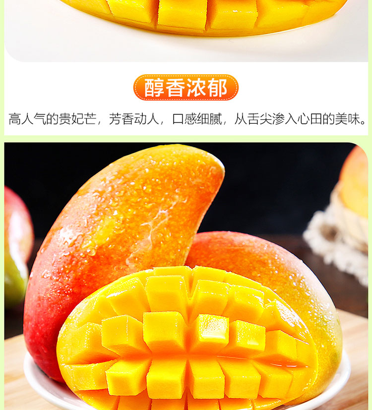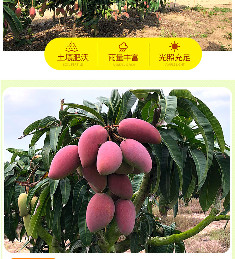 产地于东方感城镇公爱农场。该地区土地肥沃,常年高温,阳光充足,其种植的贵妃芒果香鲜口感顺滑,香甜而不腻,多汁水分充足,果肉金黄,清香四溢,个头均匀,表面光滑,肉厚皮薄,唇齿留香,产地采摘,基地直发。