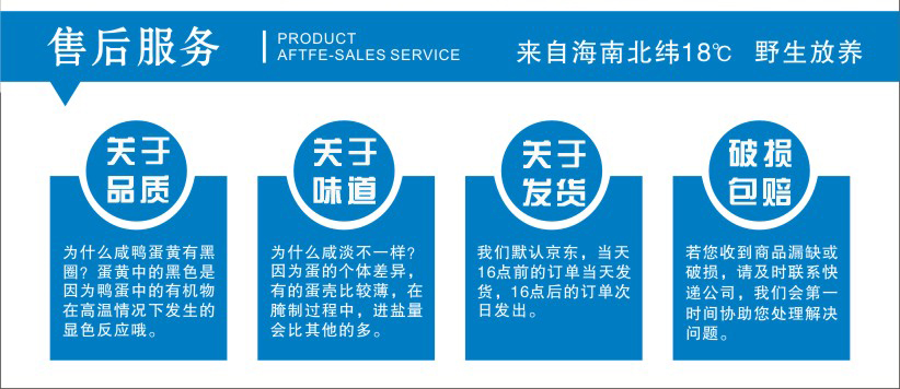 1、本次商品为:咸稥海鸭蛋 48元/20枚 2 、本次活动配送时间:今日下单,明日配送,全国可包邮。 3、如有退款问题及售后或大批量团购,请与客服交流,客服微信 18907549795 售后电话:0898-65322116 售后服务时间:9:30-18:00