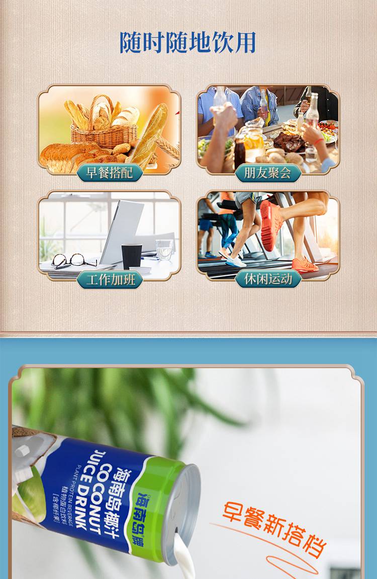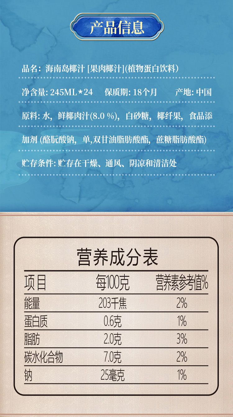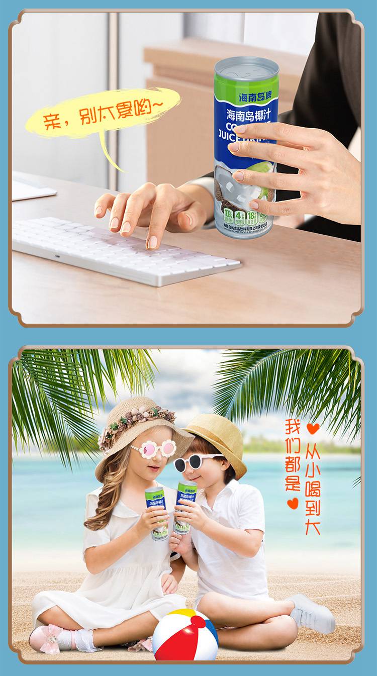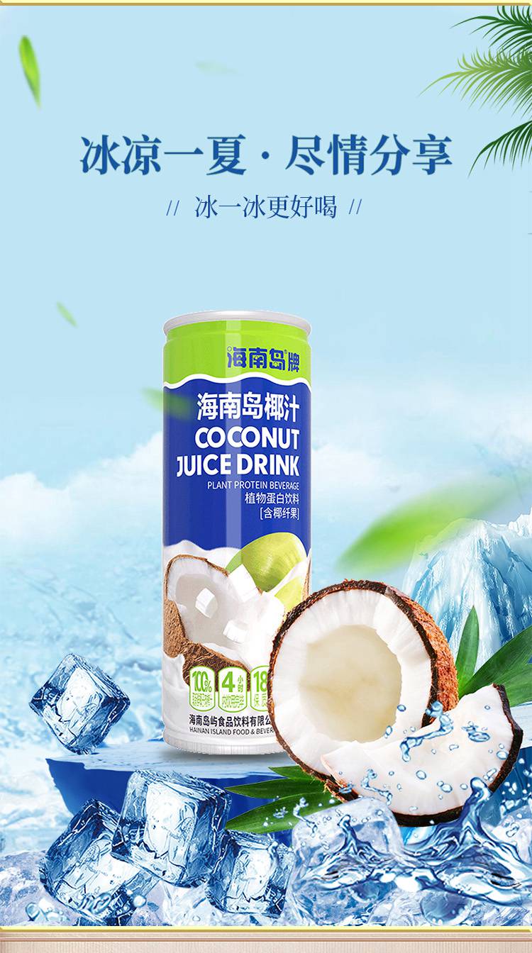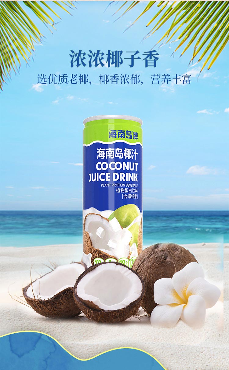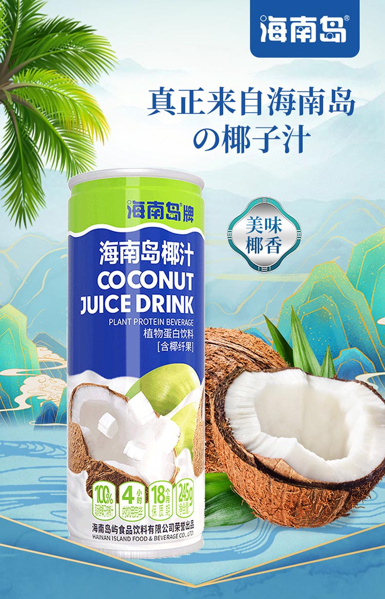 海南岛牌系列椰子汁用新鲜椰肉榨汁、采用德国先进设备加工制作而成,最大的保留了椰子的天然营养成分;是不可多得的健康饮品,海南岛牌椰子汁上市后备受各个年龄段消费者的青睐,海南岛牌椰汁远销海内外。