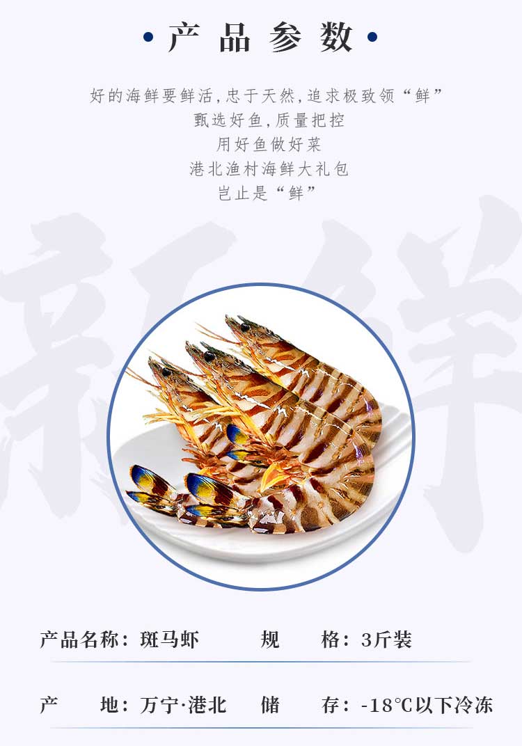 万宁港北渔村港北斑马虾-万宁市港北渔村渔业有限公司的扶贫海鲜 订单发货时效:48小时内 一、产品参数 产品名称:港北海产品斑马虾 产品产地:海南省万宁市港北海域 产品保质期:180天 存放建议:冰箱冷冻储