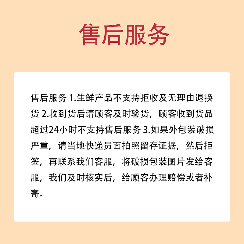 售后电话:13337562287 售后服务 1.生鲜产品不支持拒收及无理由退换货 2.收到货后请顾客及时验货,顾客收到货品超过24小时不支持售后服务 3如果外包装破损严重,请当地快递员面拍照留存证据,然后拒签,再联系我们客服,将破损包装图片发给客服,我们及时核实后,给顾客办理赔偿或者补寄