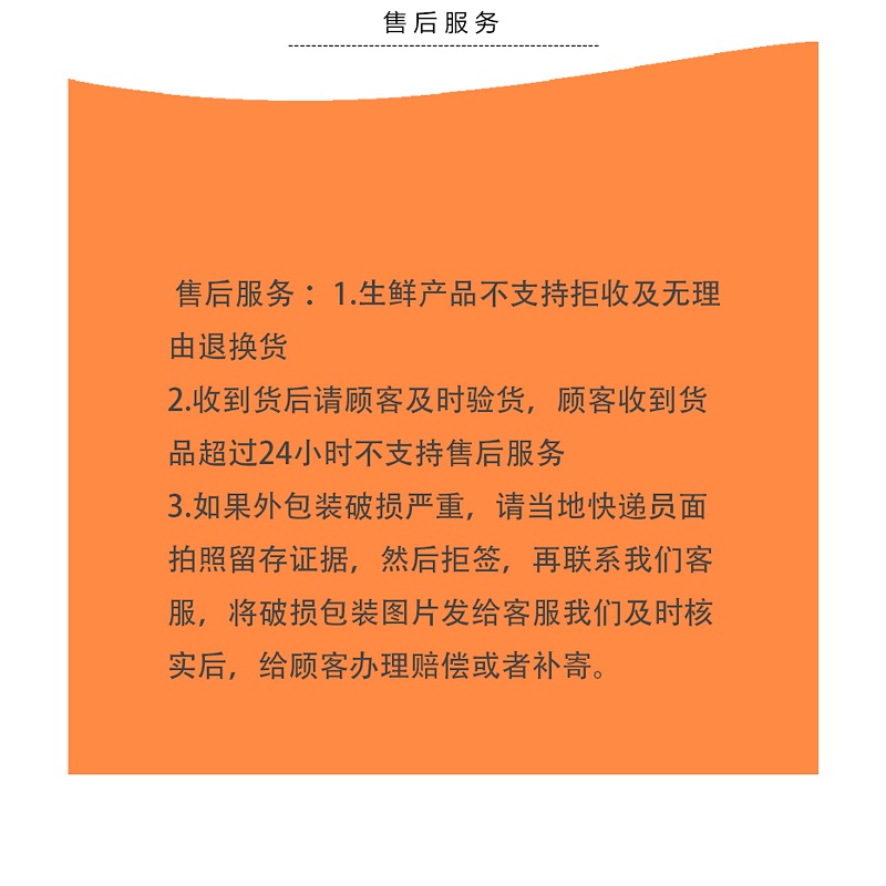 售后电话:13337562287 售后服务 1.生鲜产品不支持拒收及无理由退换货 2.收到货后请顾客及时验货,顾客收到货品超过24小时不支持售后服务 3如果外包装破损严重,请当地快递员面拍照留存证据,然后拒签,再联系我们客服,将破损包装图片发给客服,我们及时核实后,给顾客办理赔偿或者补寄