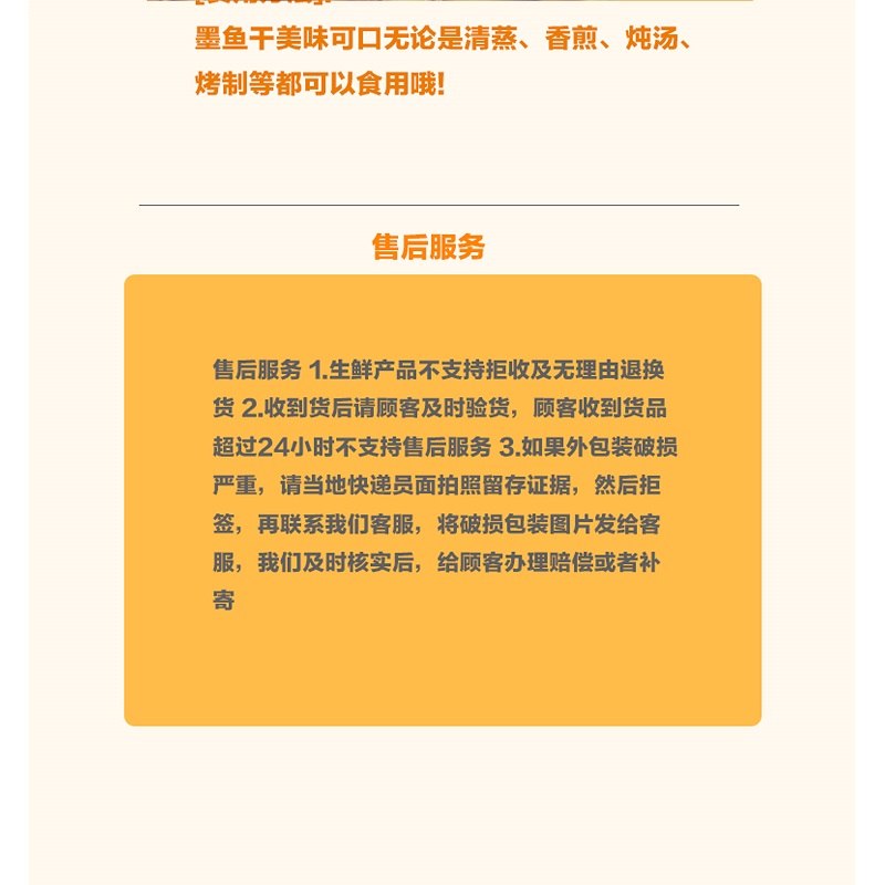 售后电话:13337562287 售后服务 1.生鲜产品不支持拒收及无理由退换货 2.收到货后请顾客及时验货,顾客收到货品超过24小时不支持售后服务 3如果外包装破损严重,请当地快递员面拍照留存证据,然后拒签,再联系我们客服,将破损包装图片发给客服,我们及时核实后,给顾客办理赔偿或者补寄