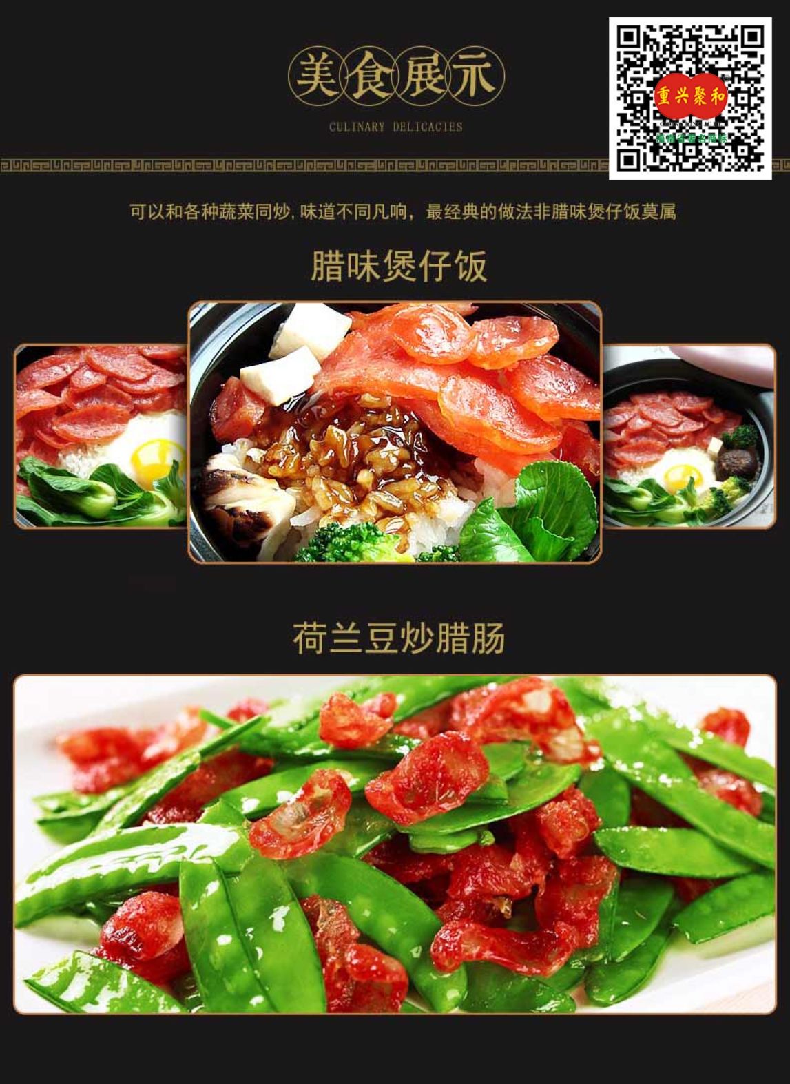 聚和黑猪腊肠是采用重兴农村黑猪鲜瘦肉和肥肉剁烂搅均匀,抖以食盐、白糖、特级生抽酱油,入肠前还洒上汾酒,捆扎后吊起来自然风干至一定程度,然后放入烘炉以烘烤至透明干爽,因而形成风味独特、爽脆、香醇、咸甜味均匀、美味可口等特点的腊肠,品质好深得品客喜爱。