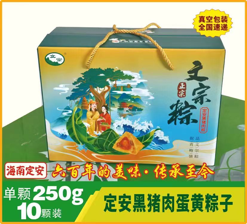 定安文宗粽是定安食品食品有限公司生产的粽子。采用定安本地黑猪肉、糯米、咸鸭蛋黄为主料,经过独门配方,精心烹饪而成,口感香醇可口,软糯香醇,令人回味。