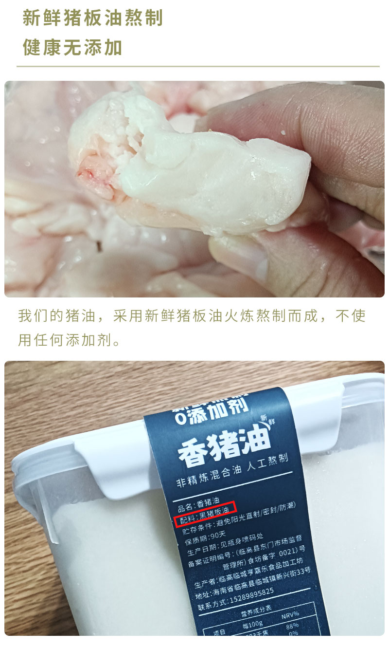 我们现在做海南本土品牌的猪油,使用的是本地猪板油,在保证猪油原有品质的前提下,