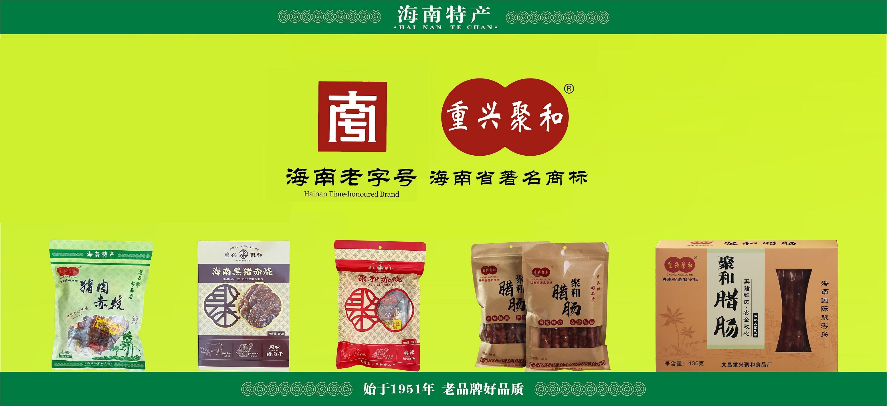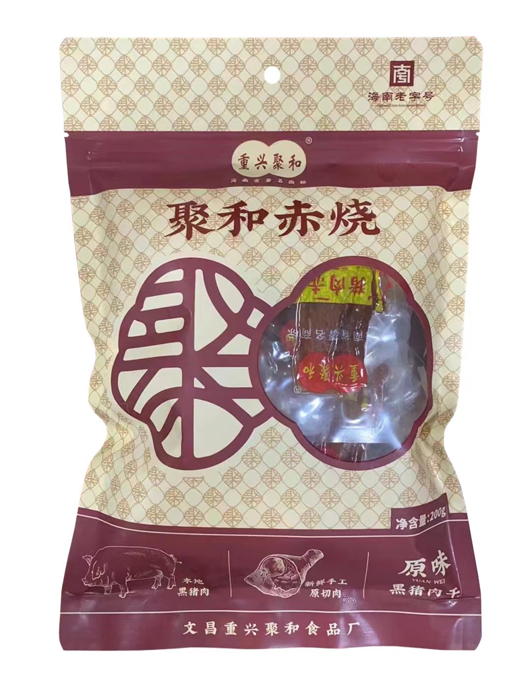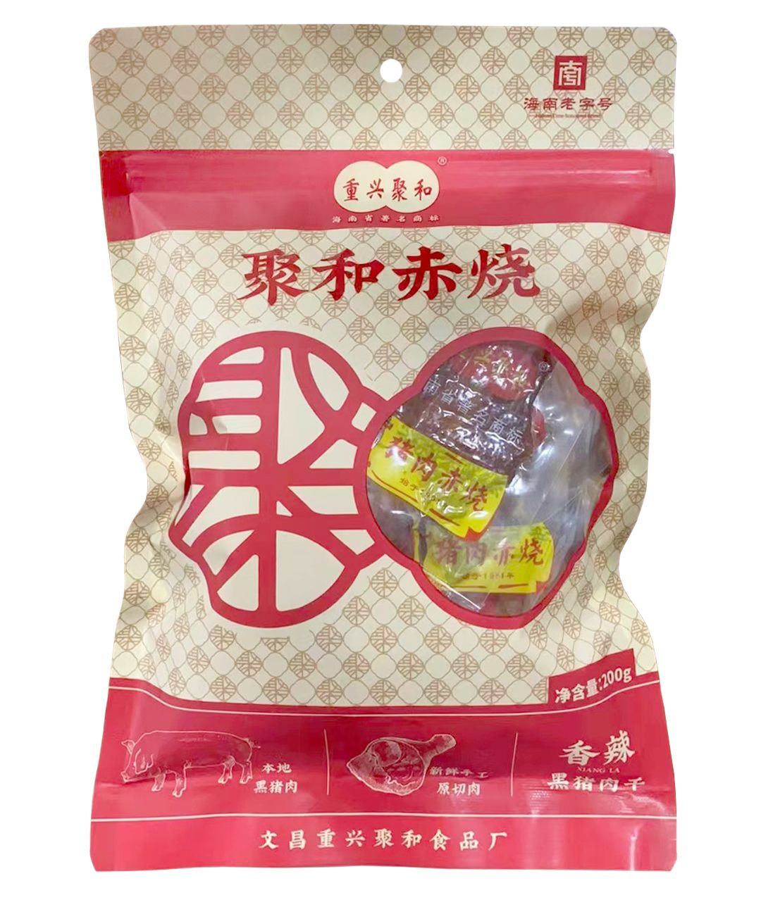 文昌重兴聚和猪肉赤烧始于1951年,选材文昌重兴黑猪,手工工艺,白胡椒粉和蜂蜜调配,日光晒干;其品鲜、香、好吃,原汁原味!曾获得海南省工商局认定为“海南省著名商标”、文昌市政府评选为“文昌十大特色小吃”、入选文昌市非物质文化遗产名录,猪肉赤烧代表性传承,2023年获得省商务厅认定为“海南老字号”品牌,2024年至2025年保障博鳌亚洲论坛年会,被授予”战略合作伙伴“,是海南文昌著名传统特色美食,文昌居民过年必备的年货特产,走亲访友必带的传统美食,体现浓浓的家乡情、家乡味。