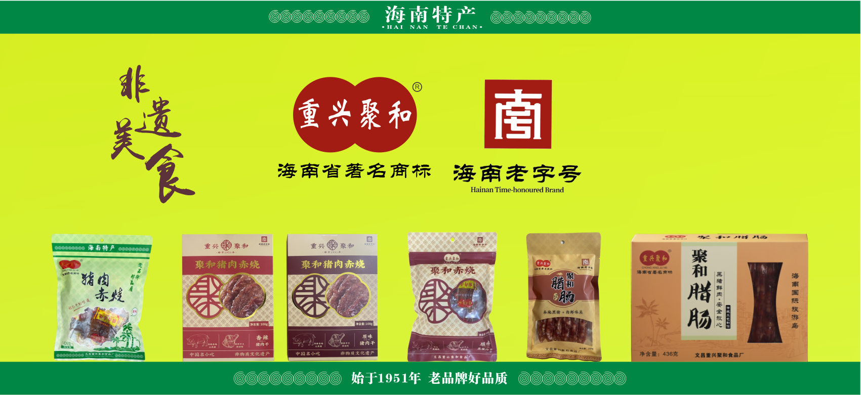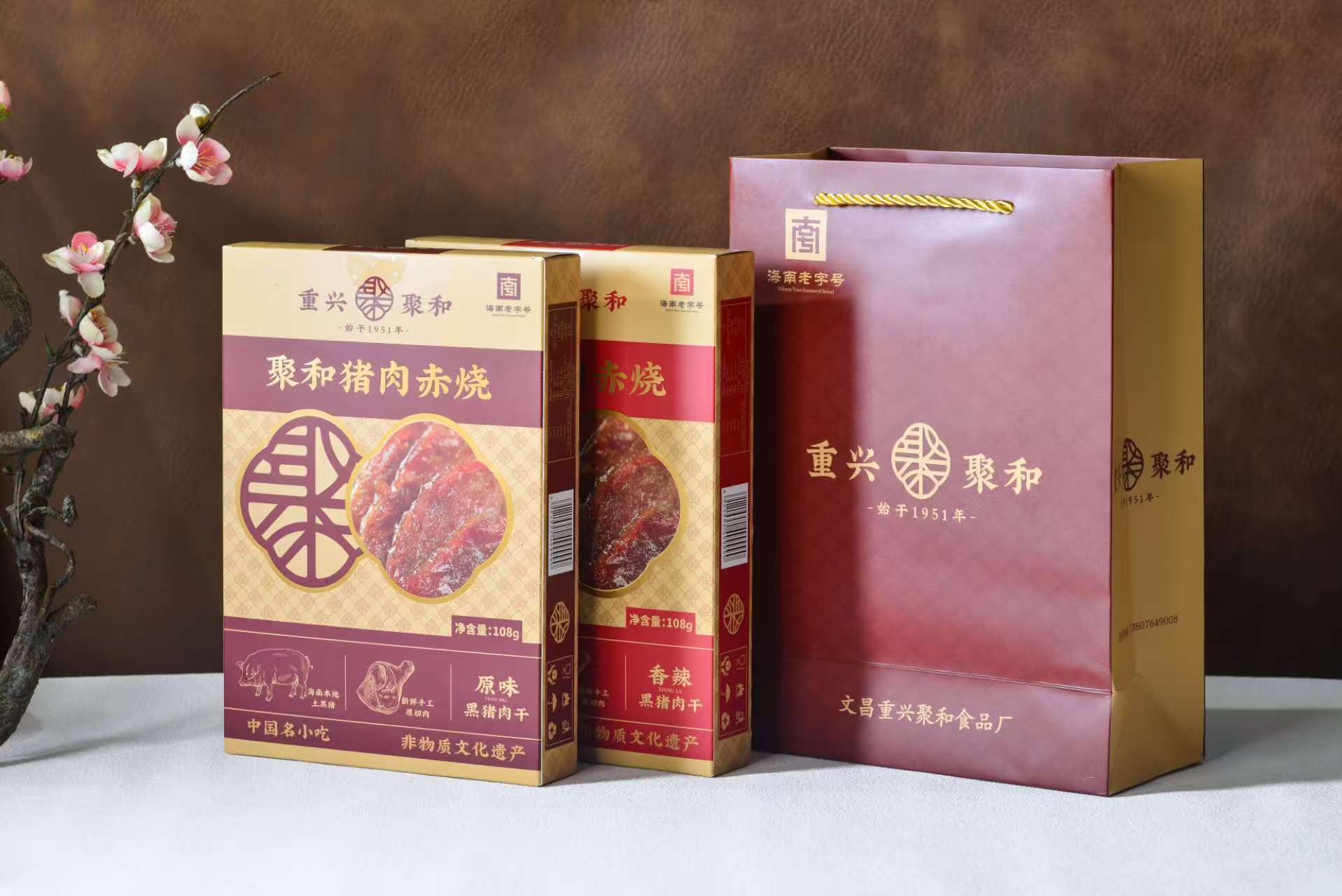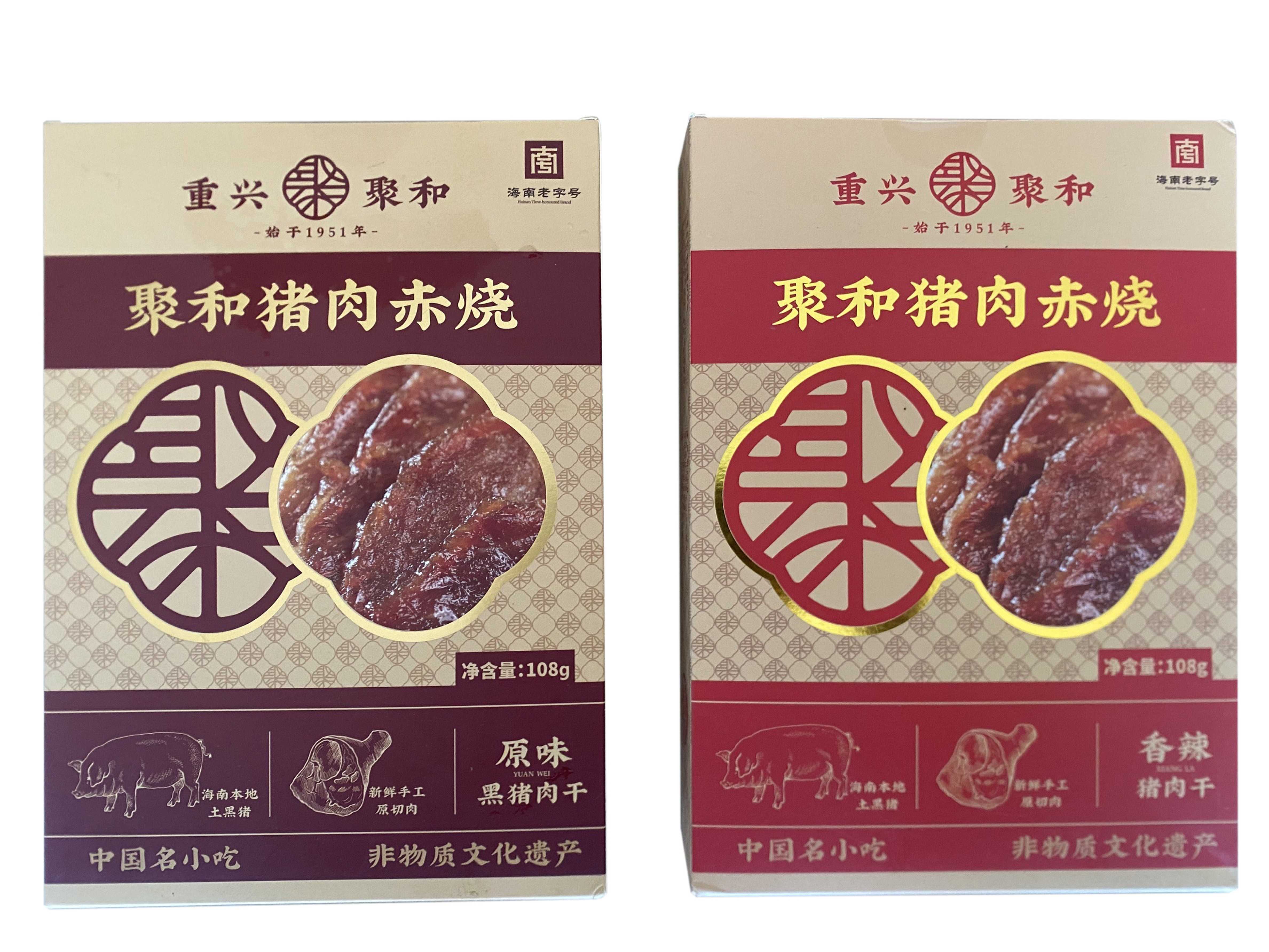 文昌重兴聚和猪肉赤烧始于1951年,产品选材自文昌重兴镇黑猪,采用手工工艺,以胡椒粉加蜂蜜调配,经自然风干制成;其口感鲜、香、好吃,尽显原汁原味!曾获得海南省工商局评为“海南省著名商标”、文昌市政府评选为“文昌十大特色小吃”、入选文昌市非物质文化遗产名录,2023年获得省商务厅认定为“海南老字号”品牌,2024年至2025年连续两年保障博鳌亚洲论坛年会特产供应,并被授予”战略合作伙伴“,已连续16年受邀参加海南省冬交会,是海南文昌著名传统特色美食,也是走亲访友必带的特产,承载着浓浓的家乡情、家乡味。