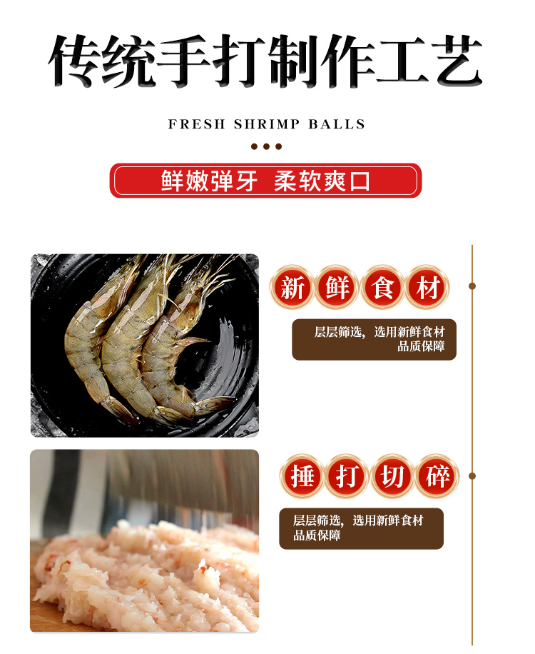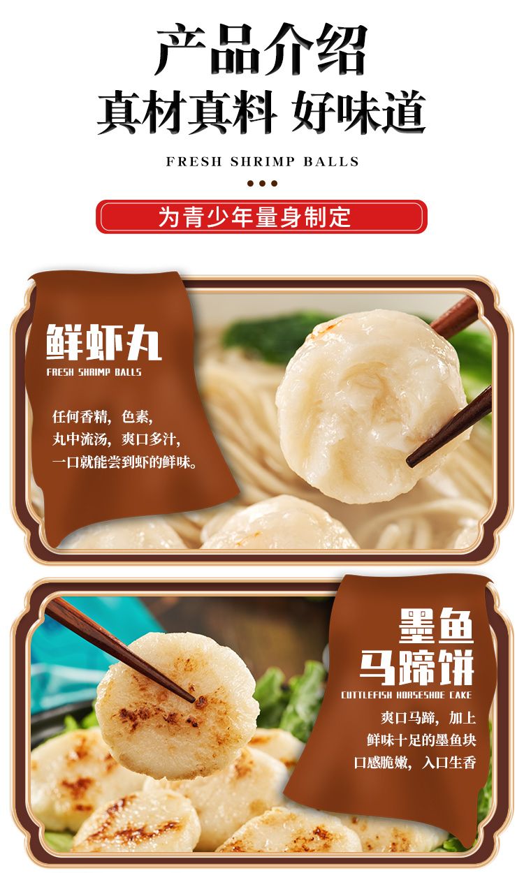 鲜虾丸、墨鱼马蹄饼、墨鱼丸、章鱼丸,传统手工制作工艺,新鲜弹牙,柔软爽口。