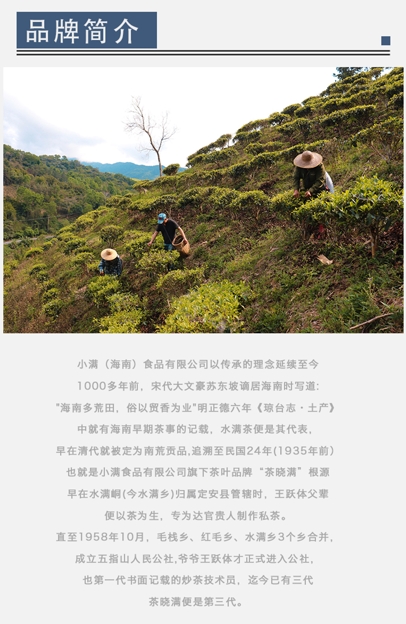 我司是一家集茶叶种植、生产、加工、销售一体化的综合性茶企,主营业务以五指山热带雨林大叶茶为主。旗下品牌有茶晓满、茶晓满的故乡,骏满红,拥有大叶红茶、大叶绿茶两个品类,我们“秉承着用一杯好茶,传递健康的品茶体验”,弘扬黎茶文化。