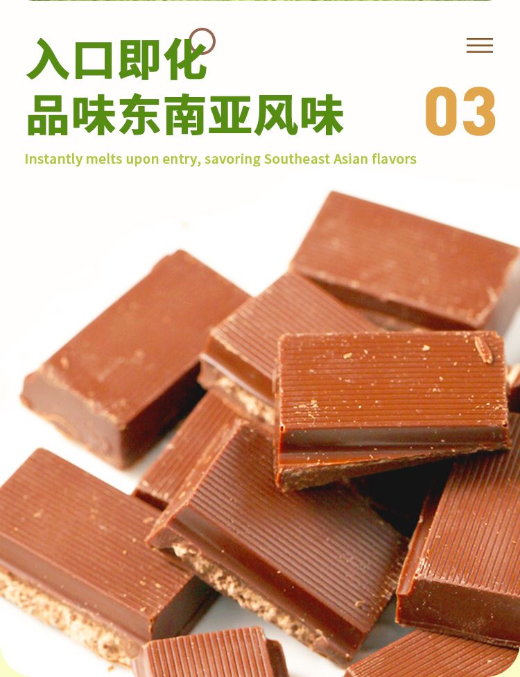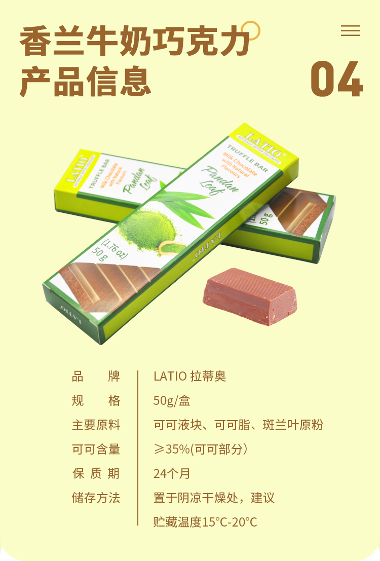 产品卖点:落地海南自贸港后独家研发口味,斑兰的清香加可可的醇香,香甜美味,回味悠长;新产品上市后在牛奶巧克力类别中热销排名第一;