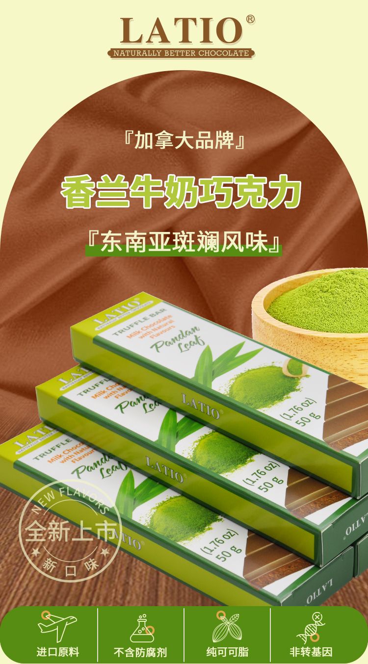 LATIO 巧克力一贯坚持纯天然 非转基因原料、不含代可可脂和类可可脂、不含氢化油、不添加人工合成色素及防腐剂、自主研发三百多种配方,用健康理念做天然、健康好吃的巧克力。