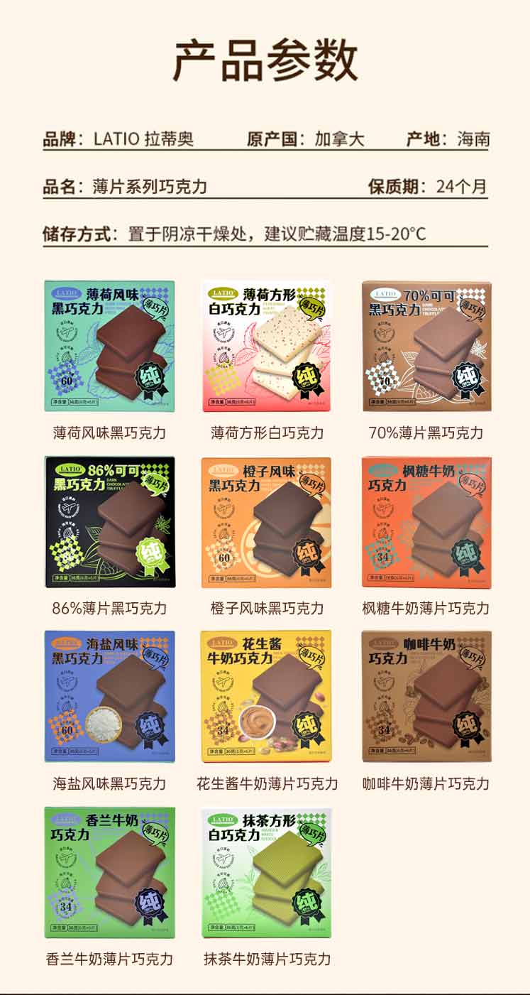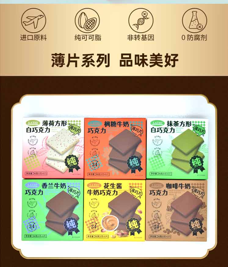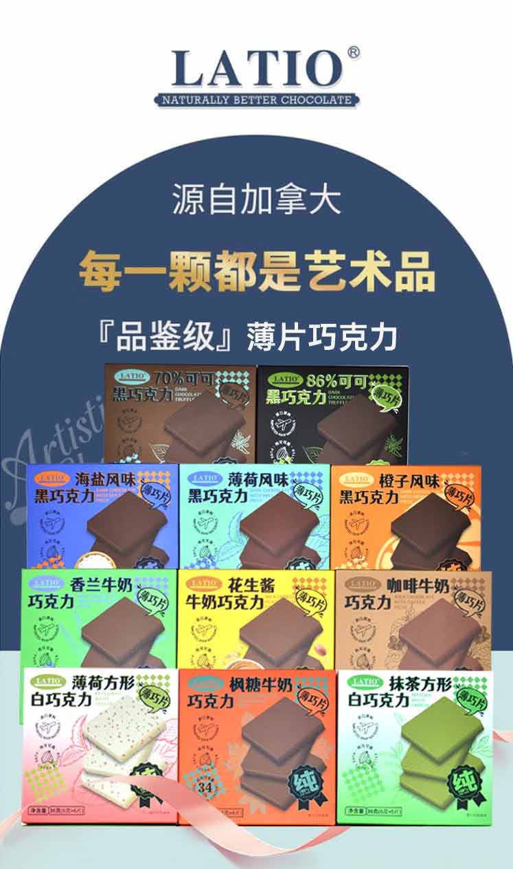 LATIO 巧克力一贯坚持纯天然 非转基因原料、不含代可可脂和类可可脂、不含氢化油、不添加人工合成色素及防腐剂、自主研发三百多种配方,用健康理念做天然、健康好吃的巧克力。