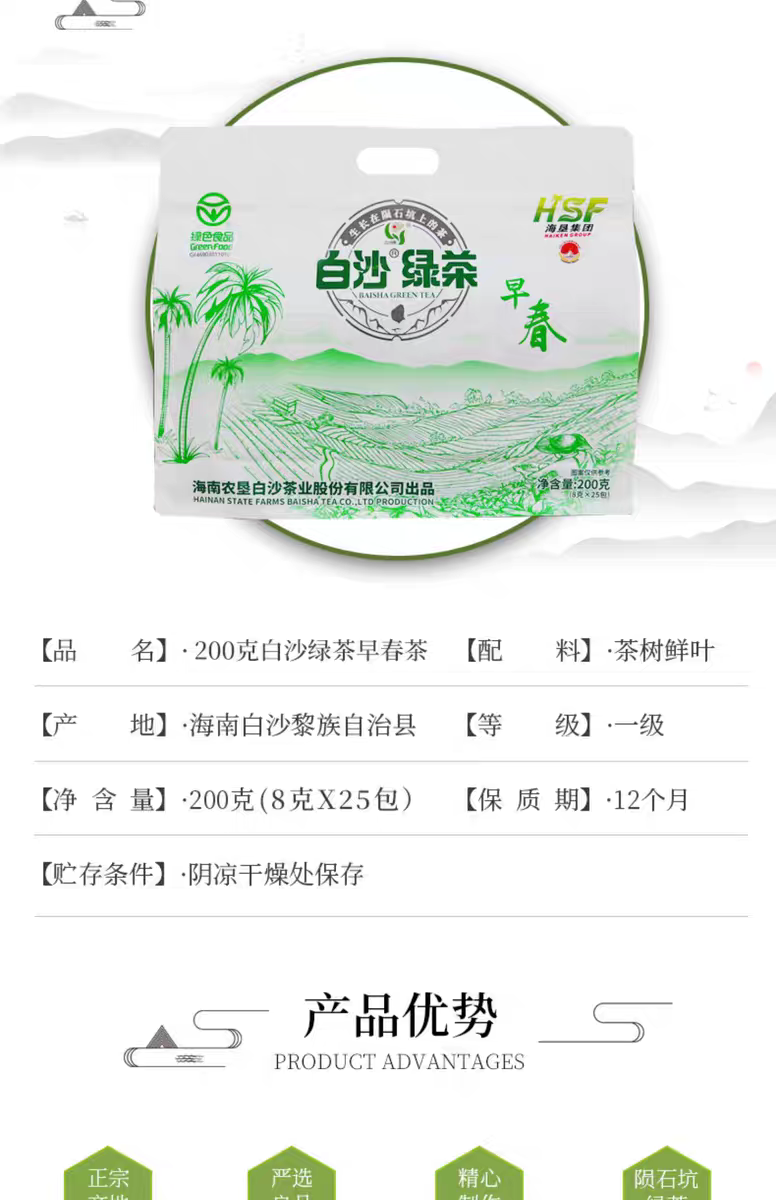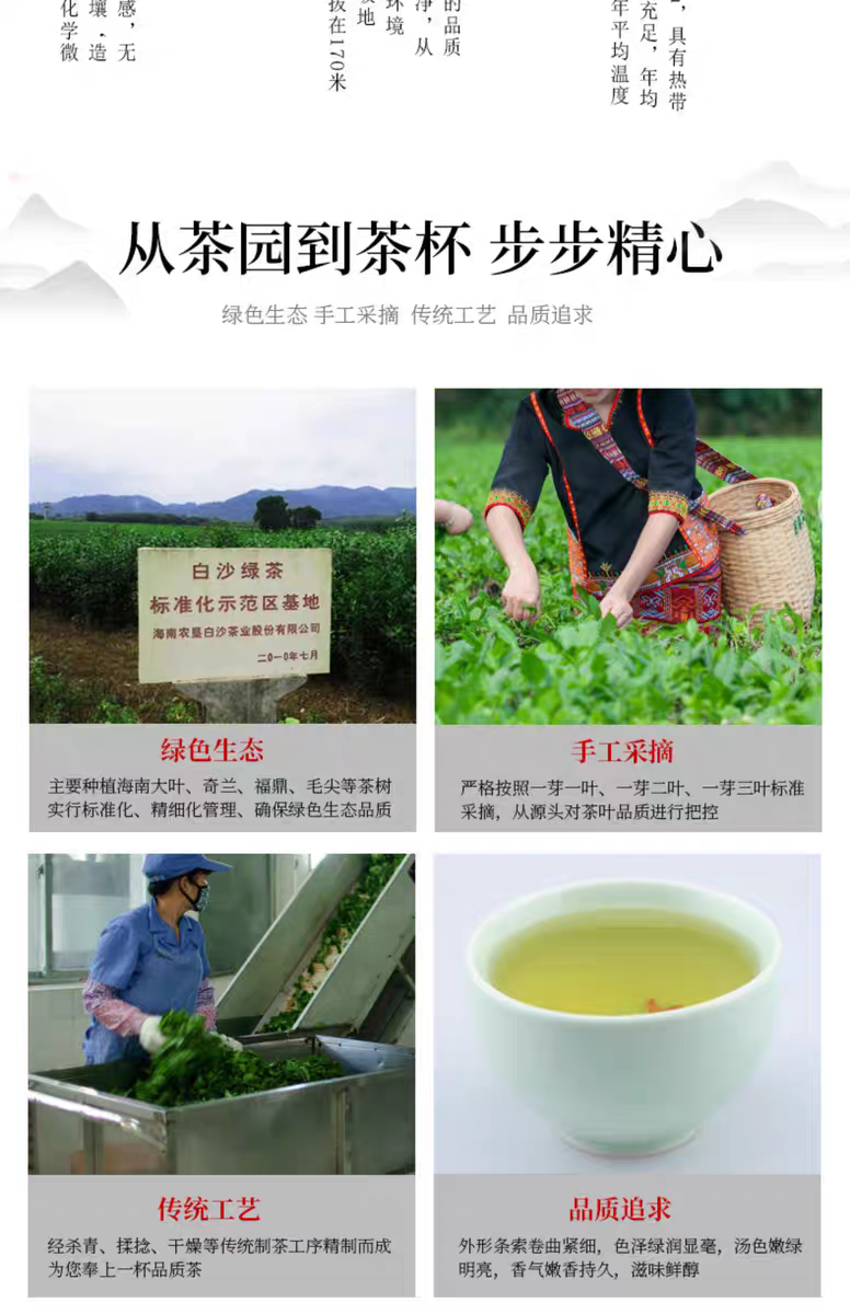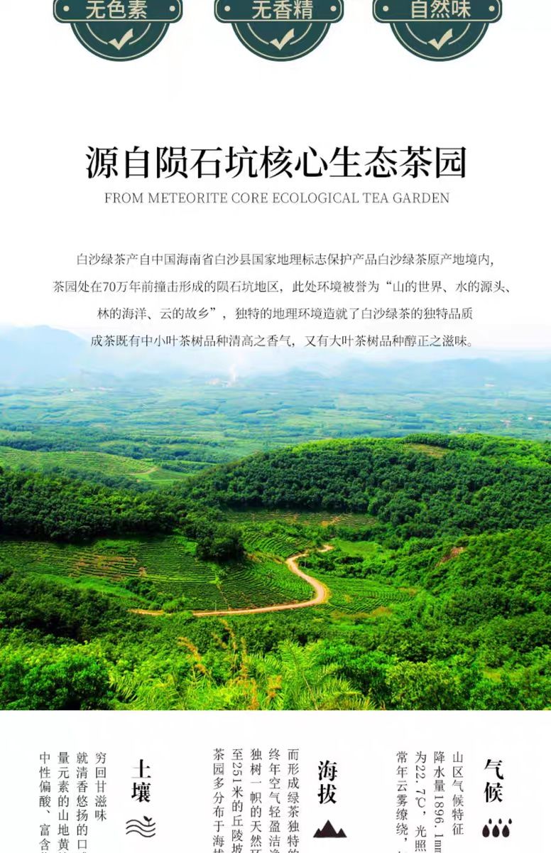 本产品出自海南大叶茶白沙产区:海南省白沙黎族自治县,地处南渡江、昌化江、珠碧江源头,属热带“三江”季风气候,是海南岛生态核心区。