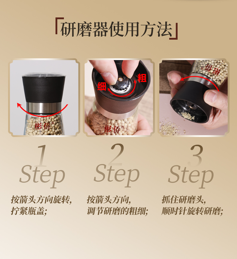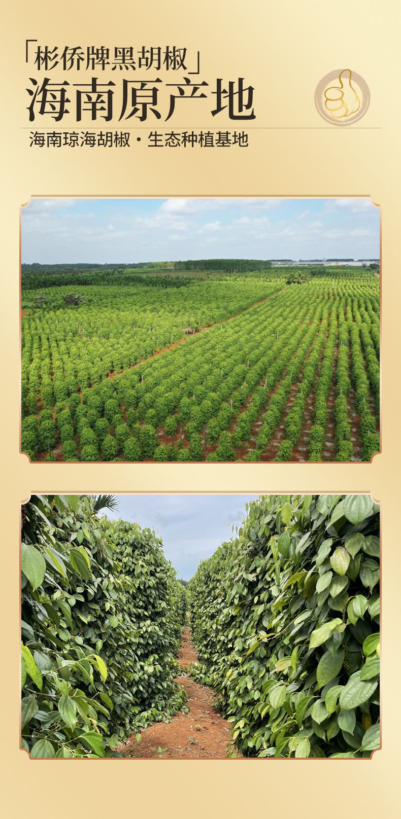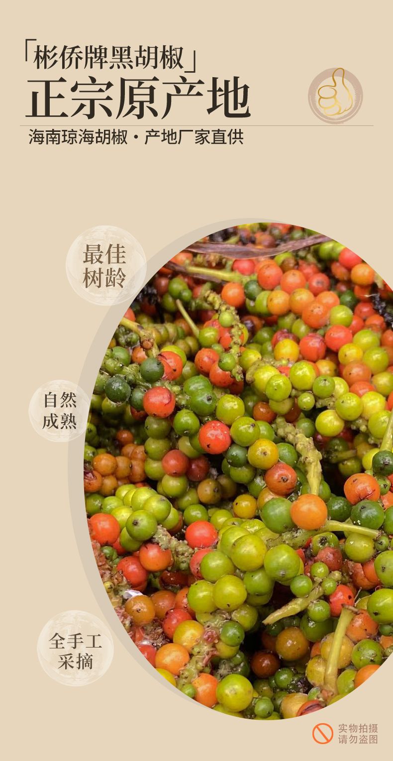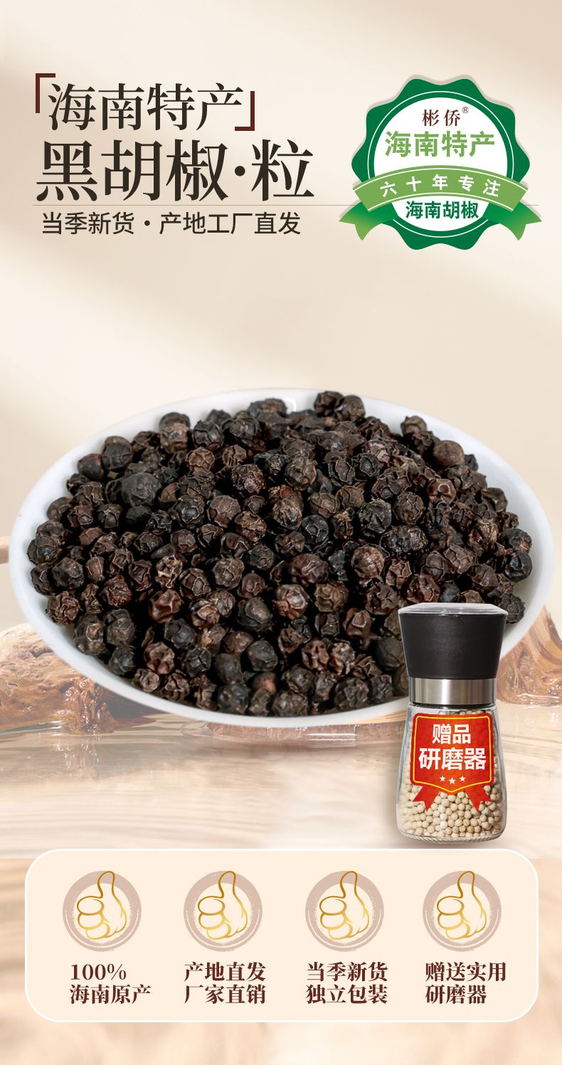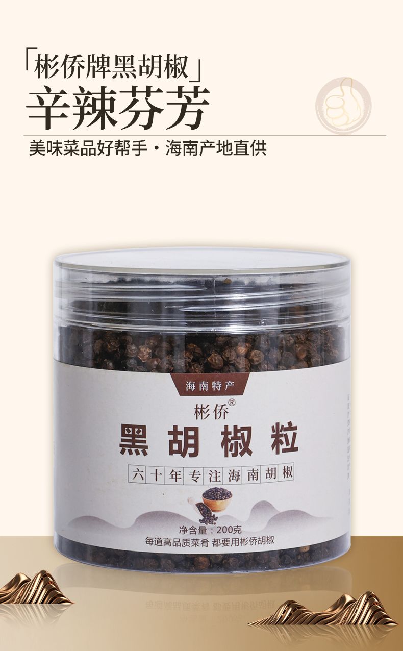 彬侨胡椒来自海南省琼海市彬村山华侨农场,至今已有60多年种植历史,是海南第一批种植胡椒基地之一。椒农坚持人工除草,使用农家肥。严格控制加工过程和采收标准,采用人工采摘,自然晾晒,颗粒均匀,去除杂质小石子,电子杀菌,安全有保障,味道更纯正。