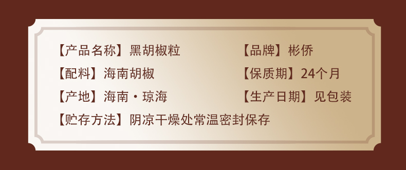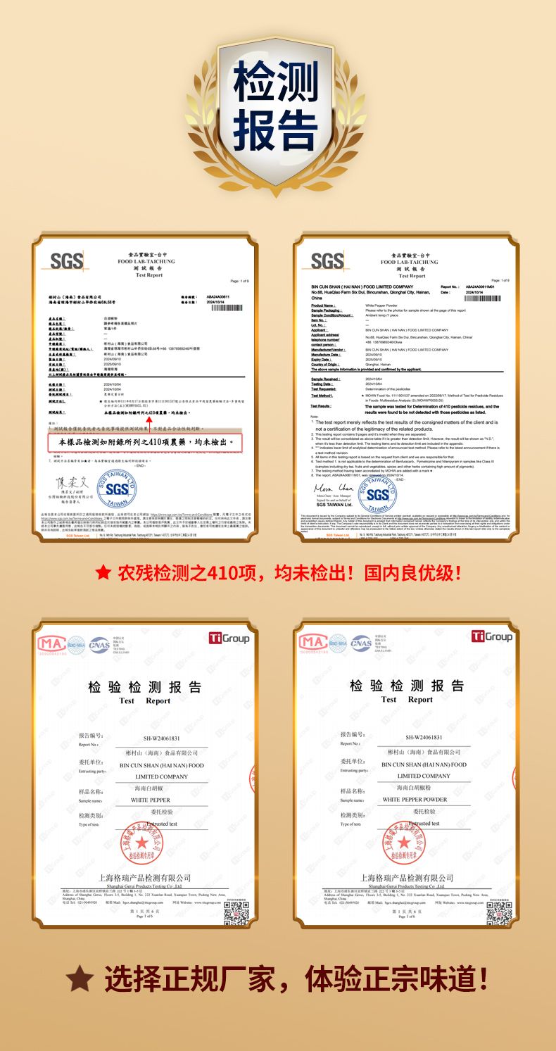 彬侨胡椒粒100%海南原产,无熏硫,无漂白,无臭味。质量有保证,经台湾SGS机构检测,410项农残项目均未检测出,经上海格瑞机构检测,生化指标和重金属都符合要求。