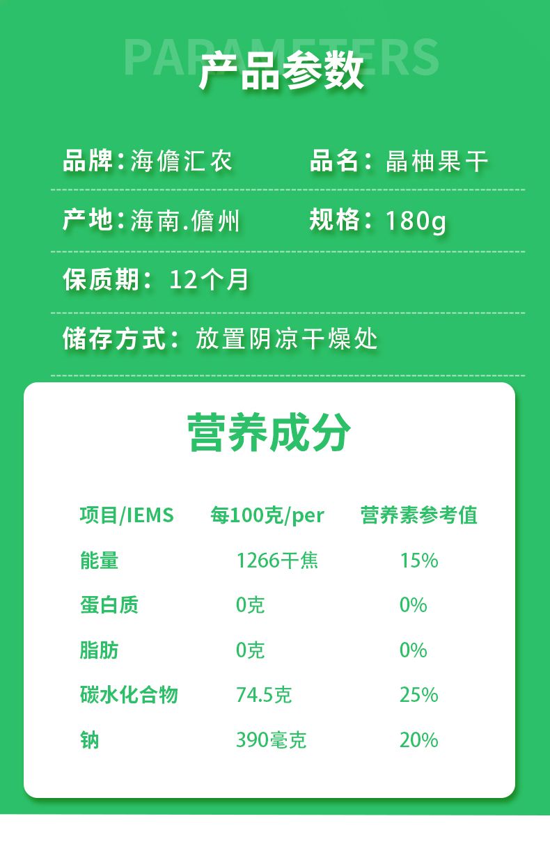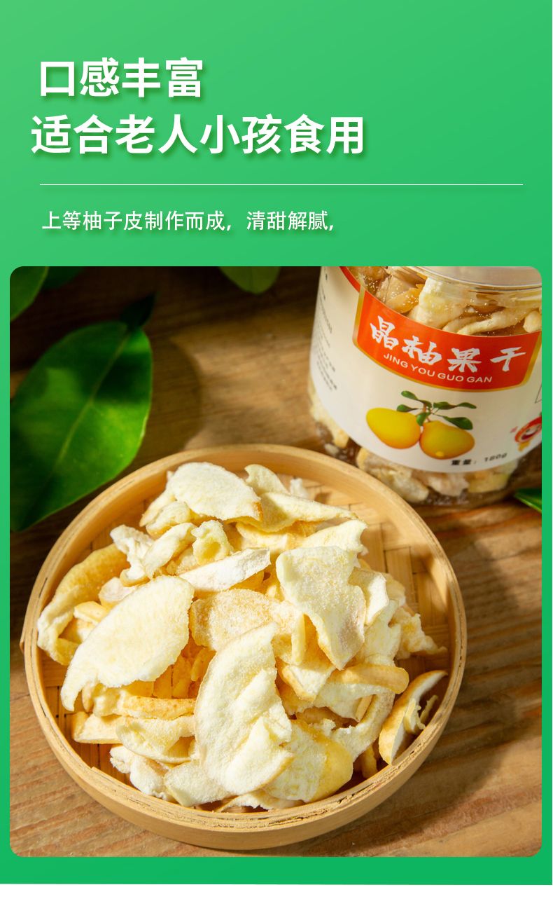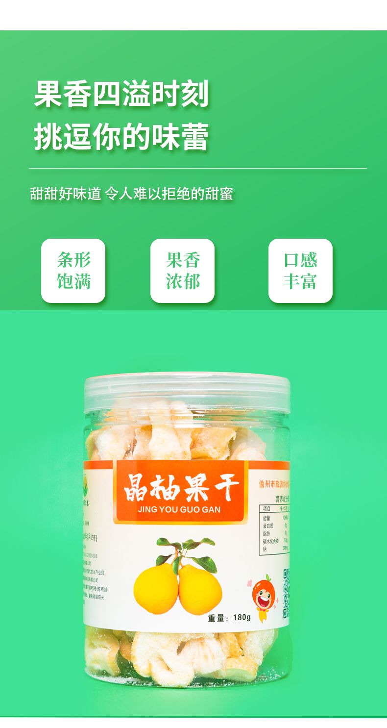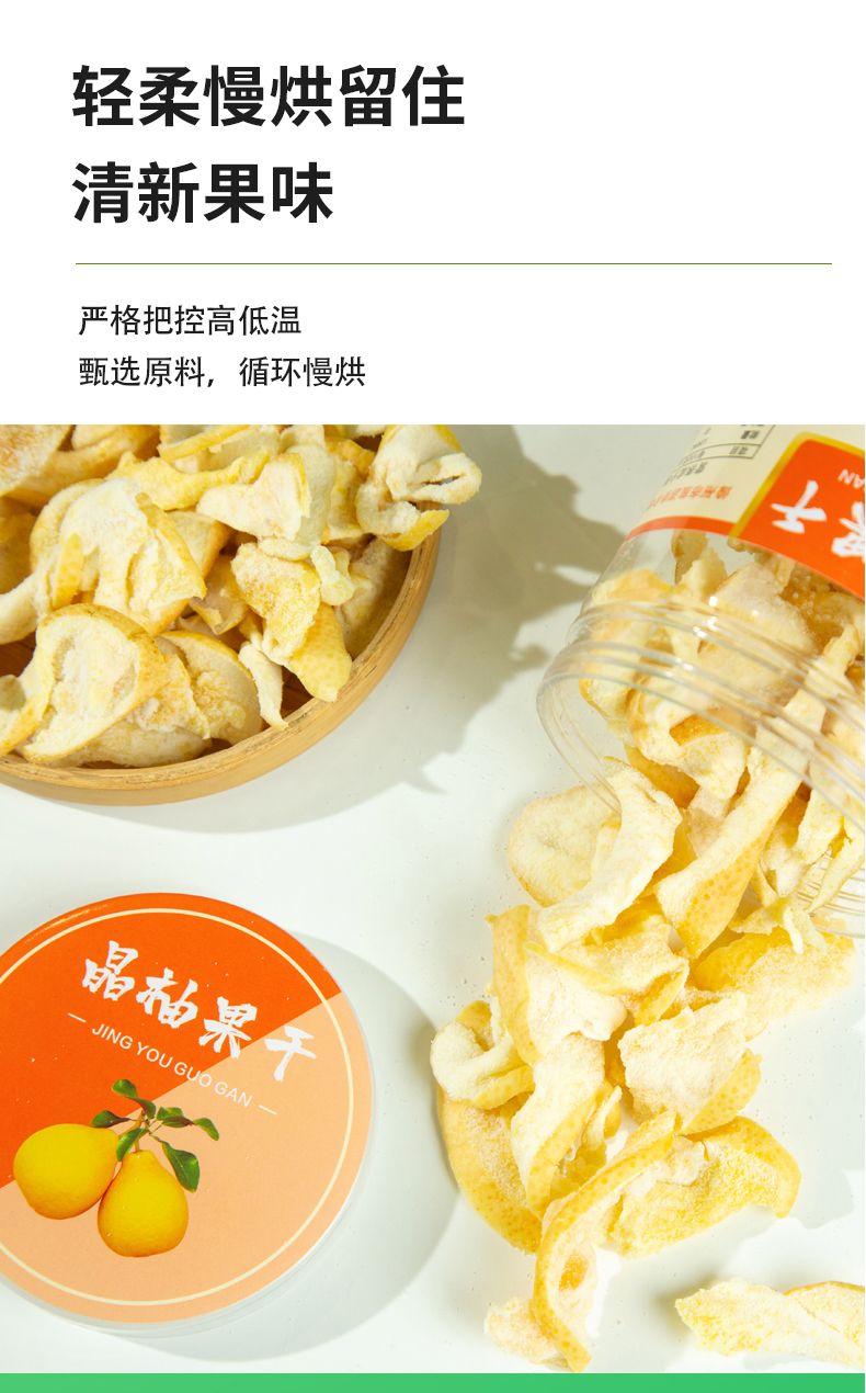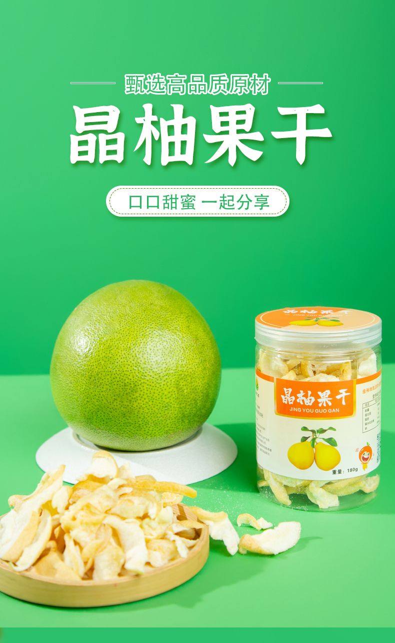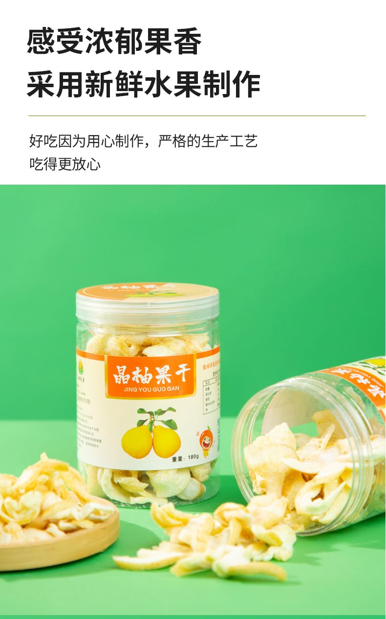 晶柚果干富含维生素与矿物质,具有滋润肺燥、舒缓咳嗽、补充营养的功效。其口感鲜美,常食可增强免疫力,助消化,延缓衰老。晶柚果干也含有天然果糖,具有益肝保肾的作用,是一种营养健康的健康零食。
