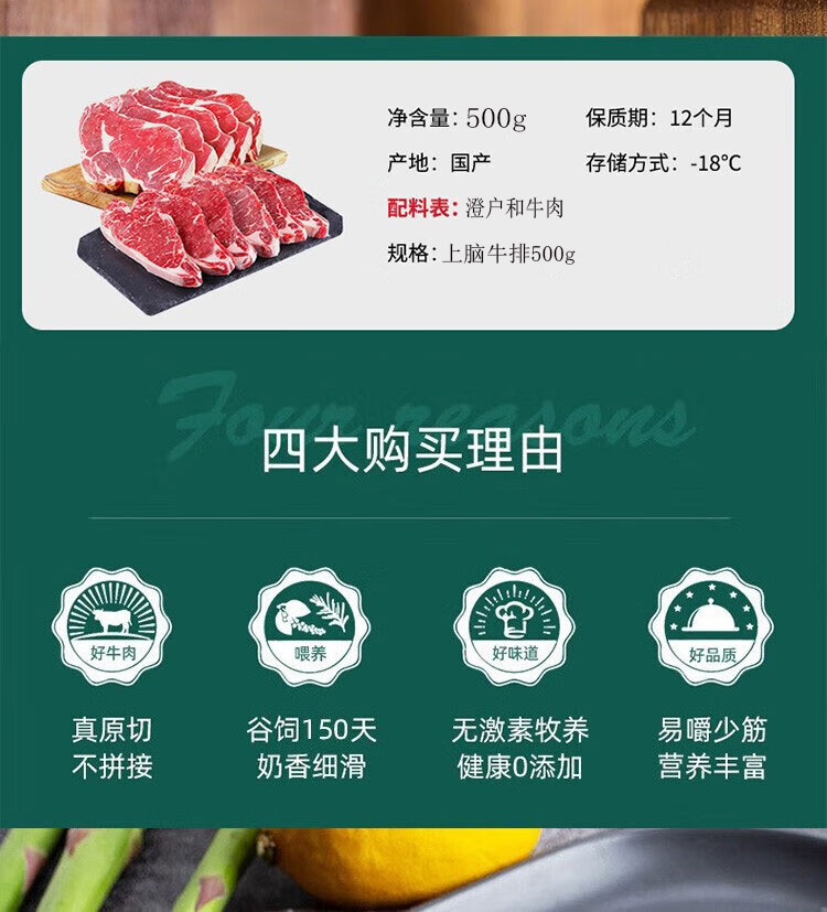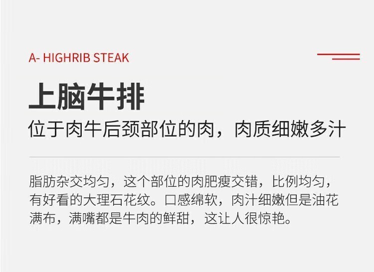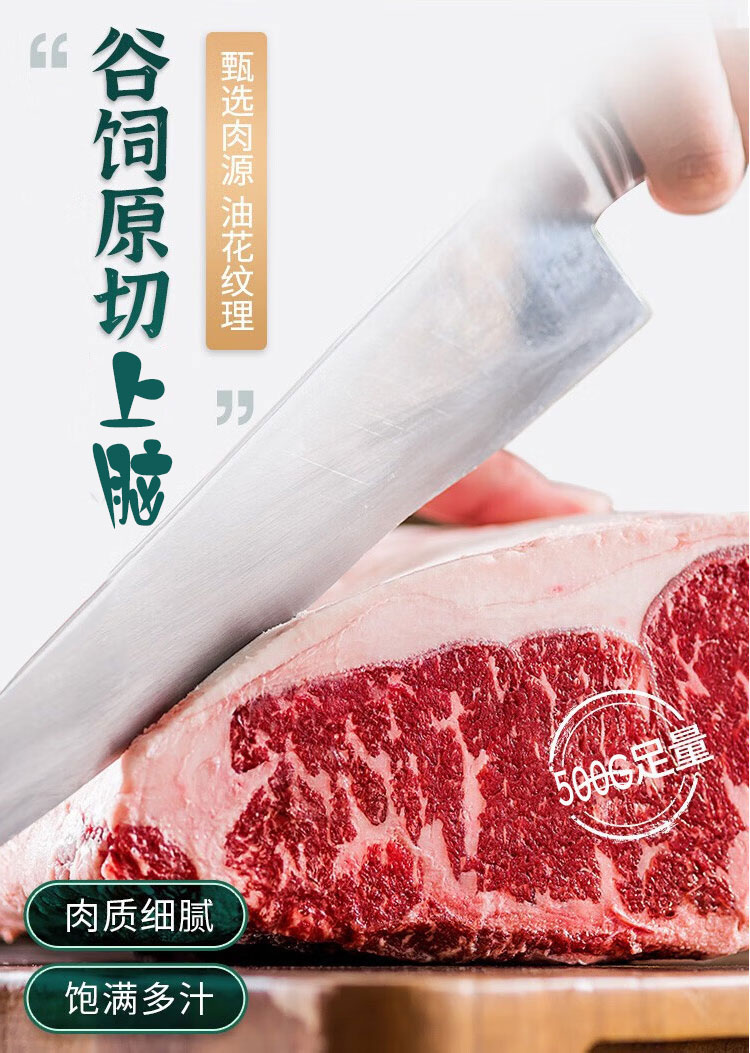 柔嫩多汁:上脑部位肉质细腻,脂肪与瘦肉比例平衡,煎烤后外焦里嫩,汁水充盈。