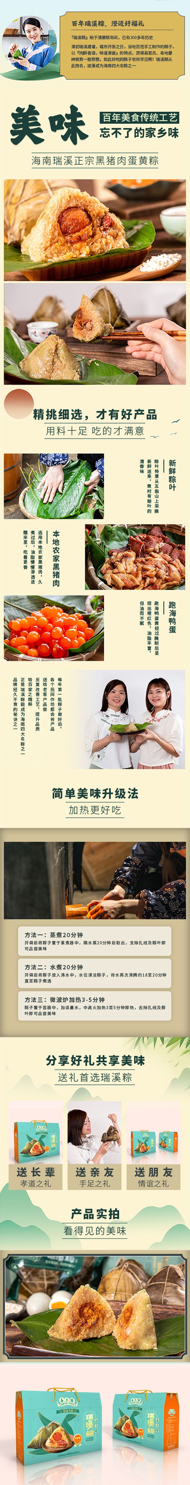 瑞溪粽以糯米、猪肉、咸蛋黄为主要原料制作而成,其粽叶取自海南岛最高山——五指山上的新鲜叶子,用这样的粽叶包粽可以煮出天然的清香味和淡淡的黄绿色。粽里的猪肉则是澄迈当地的农家黑猪肉,经过高温烹煮后,肥腻部分已化为油脂溶入糯米中,而精瘦部分也是入口即化。粽里的咸蛋黄更是灵魂,鸭蛋来自于澄迈当地的九龙溪,溪水清澈无比,放养的鸭子吃了溪里的蚌,生得胖乎乎,下蛋有营养。蛋黄橙红色,黄油脂多而不腻。瑞溪粽佐料配制独特,全部采用手工制作而成,放入锅中水煮12小时后出炉,具有口感酥松,味道清香,吃后不腻的特点。拨开一个瑞溪粽,热气混合着清香扑鼻而来,咬上一口,被高温化开的肥腻和流汁的咸蛋黄沁入了绵软又带弹性的糯米,香味十足,再咬第二口,黑猪肉、红蛋黄、绿糯米配合着透明的油脂,在舌面上瞬间合而为一,浓郁的香味犹如泉水一样喷涌而出,在唇齿间流淌……