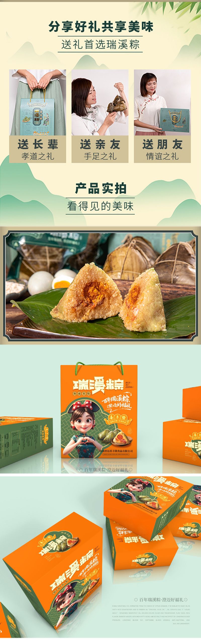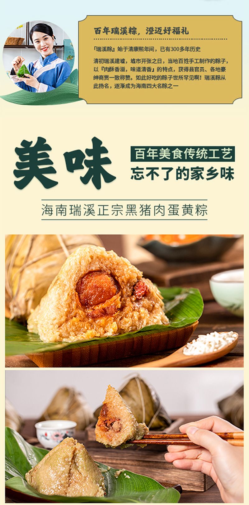 瑞溪粽以糯米、猪肉、咸蛋黄为主要原料制作而成,其粽叶取自海南岛最高山——五指山上的新鲜叶子,用这样的粽叶包粽可以煮出天然的清香味和淡淡的黄绿色。粽里的猪肉则是澄迈当地的农家黑猪肉,经过高温烹煮后,肥腻部分已化为油脂溶入糯米中,而精瘦部分也是入口即化。粽里的咸蛋黄更是灵魂,鸭蛋来自于澄迈当地的九龙溪,溪水清澈无比,放养的鸭子吃了溪里的蚌,生得胖乎乎,下蛋有营养。蛋黄橙红色,黄油脂多而不腻。瑞溪粽佐料配制独特,全部采用手工制作而成,放入锅中水煮12小时后出炉,具有口感酥松,味道清香,吃后不腻的特点。拨开一个瑞溪粽,热气混合着清香扑鼻而来,咬上一口,被高温化开的肥腻和流汁的咸蛋黄沁入了绵软又带弹性的糯米,香味十足,再咬第二口,黑猪肉、红蛋黄、绿糯米配合着透明的油脂,在舌面上瞬间合而为一,浓郁的香味犹如泉水一样喷涌而出,在唇齿间流淌……