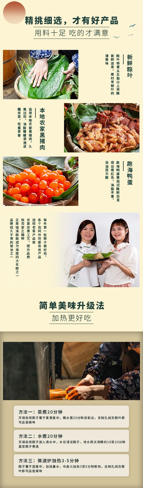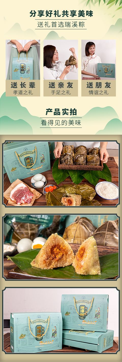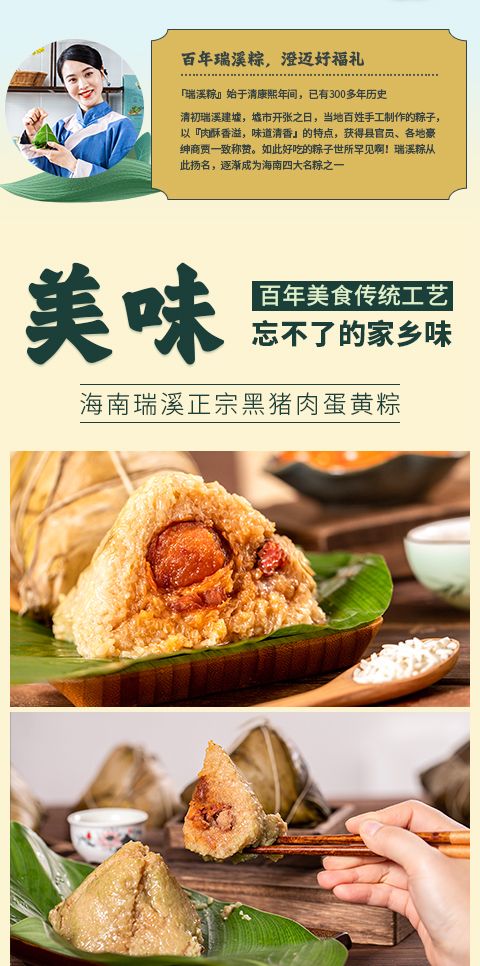 瑞溪粽以糯米、猪肉、咸蛋黄为主要原料制作而成,其粽叶取自海南岛最高山——五指山上的新鲜叶子,用这样的粽叶包粽可以煮出天然的清香味和淡淡的黄绿色。粽里的猪肉则是澄迈当地的农家黑猪肉,经过高温烹煮后,肥腻部分已化为油脂溶入糯米中,而精瘦部分也是入口即化。粽里的咸蛋黄更是灵魂,鸭蛋来自于澄迈当地的九龙溪,溪水清澈无比,放养的鸭子吃了溪里的蚌,生得胖乎乎,下蛋有营养。蛋黄橙红色,黄油脂多而不腻。瑞溪粽佐料配制独特,全部采用手工制作而成,放入锅中水煮12小时后出炉,具有口感酥松,味道清香,吃后不腻的特点。拨开一个瑞溪粽,热气混合着清香扑鼻而来,咬上一口,被高温化开的肥腻和流汁的咸蛋黄沁入了绵软又带弹性的糯米,香味十足,再咬第二口,黑猪肉、红蛋黄、绿糯米配合着透明的油脂,在舌面上瞬间合而为一,浓郁的香味犹如泉水一样喷涌而出,在唇齿间流淌……
