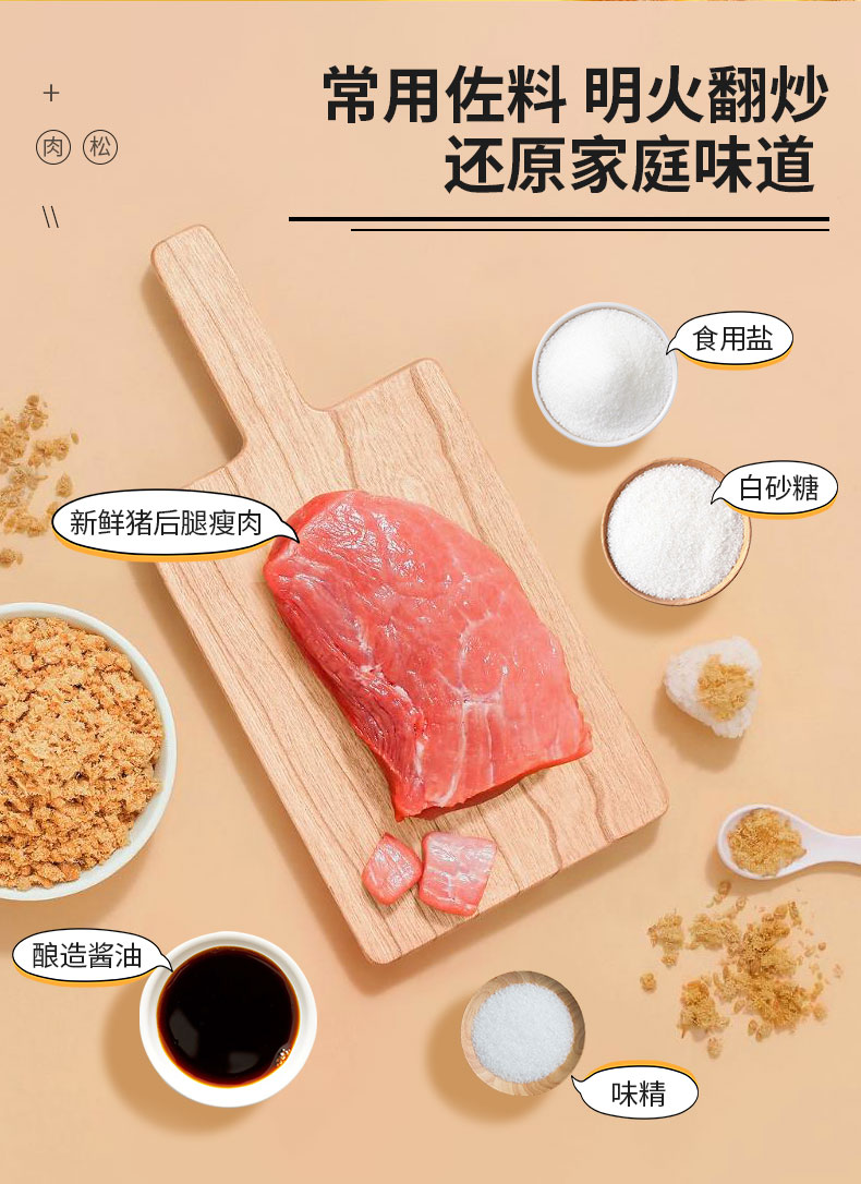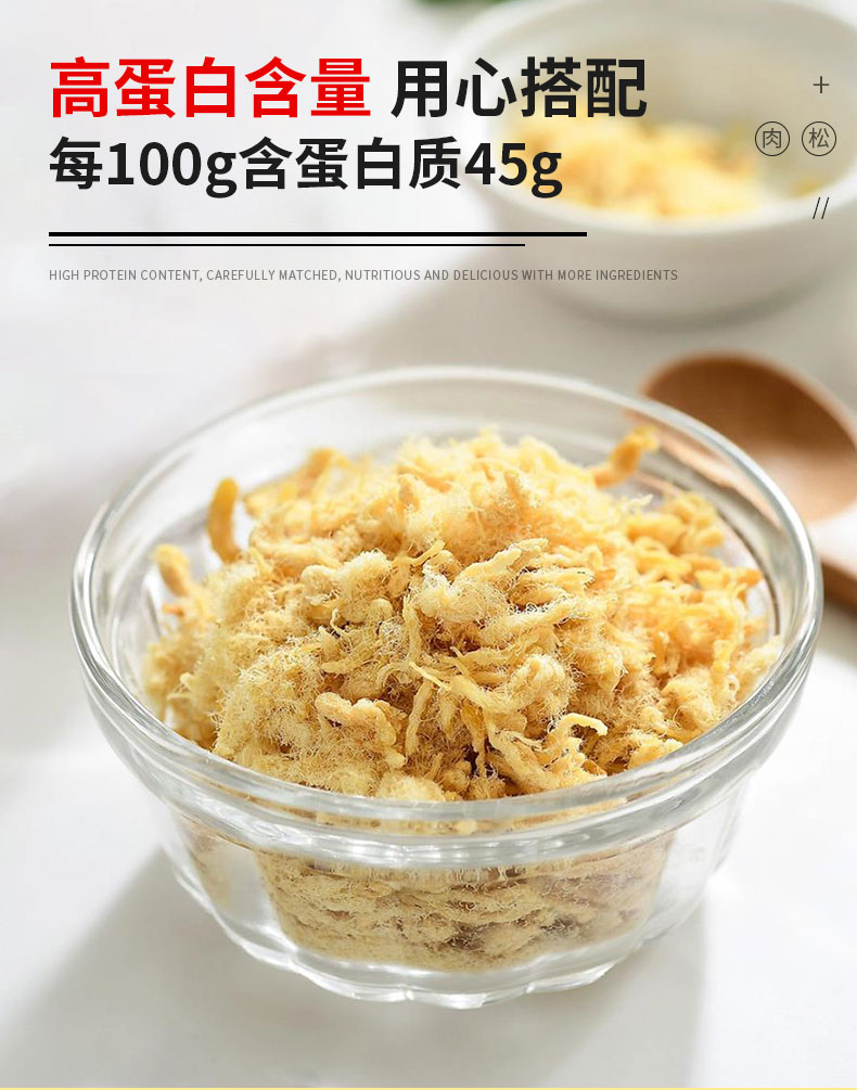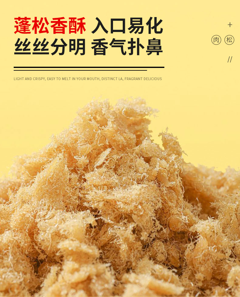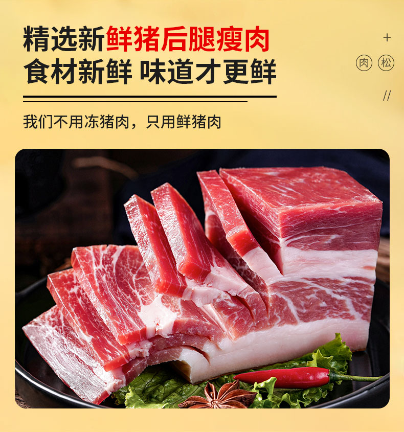 精选新鲜猪后腿瘦肉,常用佐料明火翻炒,蓬松香酥,入口易化,配料简单,不含防腐剂,健康绿色食品。
