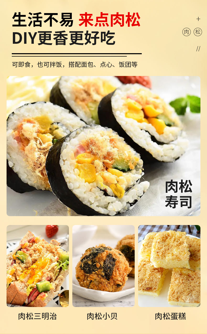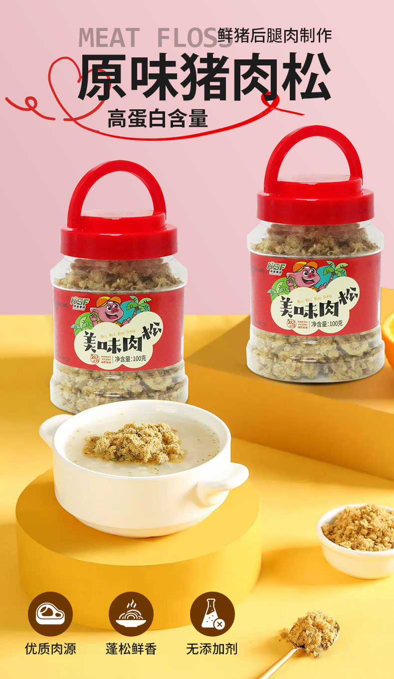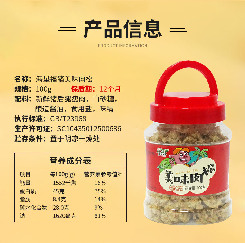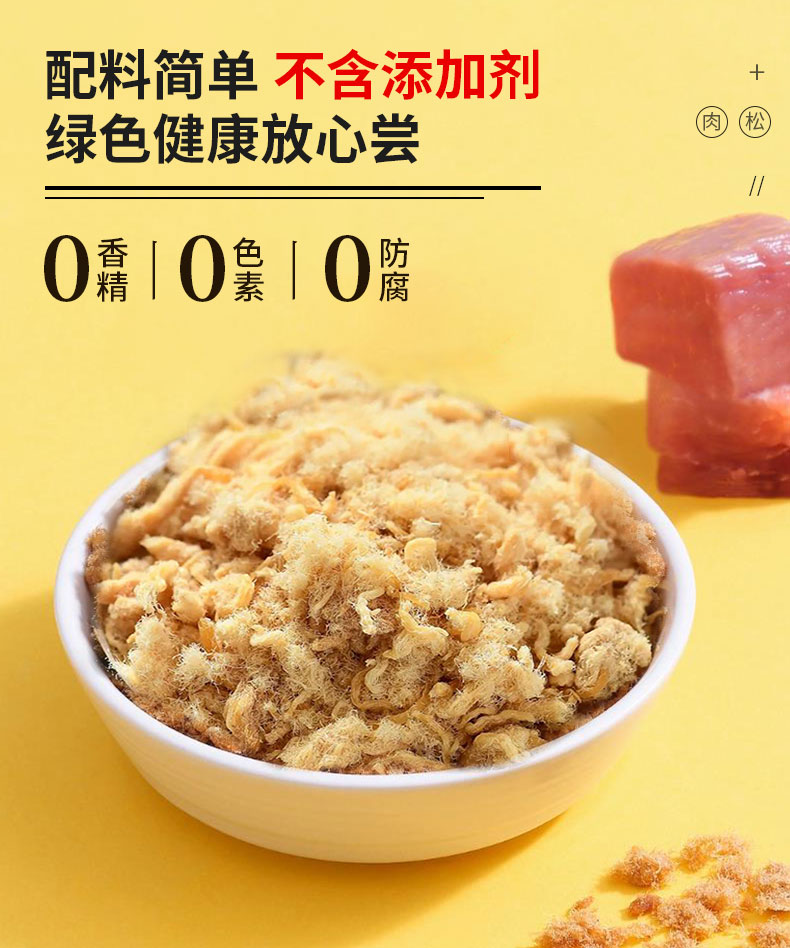 精选新鲜猪后腿瘦肉,常用佐料明火翻炒,蓬松香酥,入口易化,配料简单,不含防腐剂,健康绿色食品。