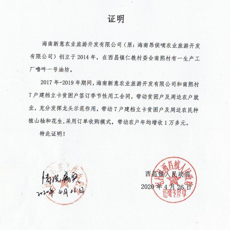 海南新意农业旅游开发有限公司成立于2014年7月,公司本着“利人、立本、不争”的理念推动海南山柚及小种花生产业的发展,力求以品牌助推农产品升级,拉动新农村建设,实现三产联动产村融合助推国家倡导的“精准扶贫、精准脱贫”的政策,实现产业品牌化发展、农民持续性增收的目的。我司2016年1月投资1000万的油坊正式投产,噜吽一号油坊是海南省一家达到自动化、标准化、油品达到出口级的榨油厂,噜吽1号油坊主要生产海南花生油及山柚油,它的出现代表着海南省优质山柚油、花生油全产业链的发展,让看得见的生产,看得见的好油惠及更多的广大人群。