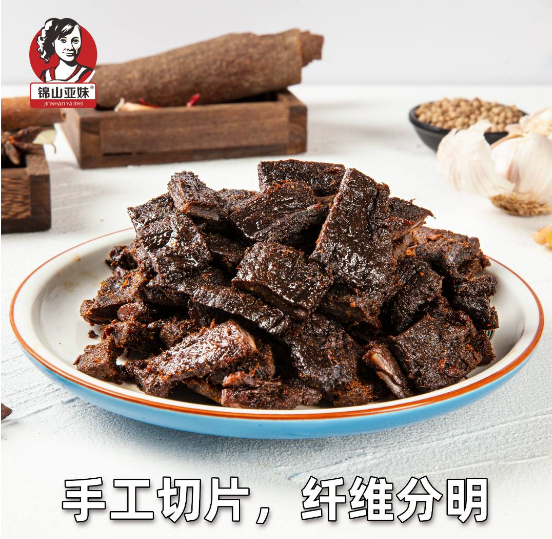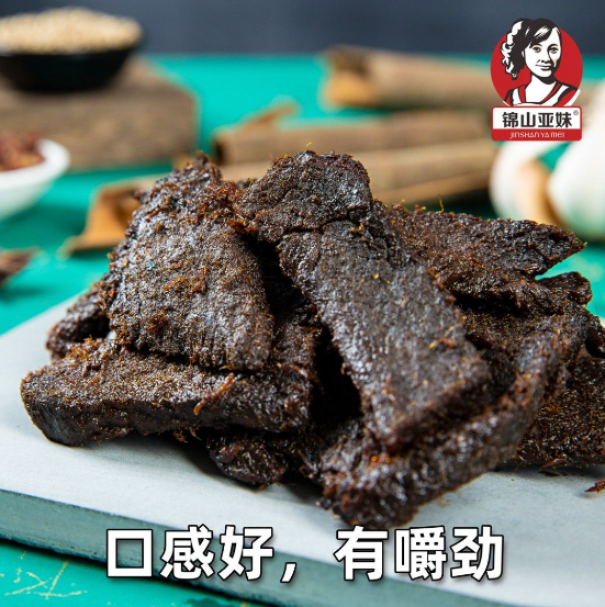 “亚妹牛肉干”传承锦山牛肉干上百年的传统工艺和配方 并不断创新,通过精细化,一体化的加工流程,以过硬的 产品质量,从一个路边小摊发展成为海南特色品牌,更让 “亚妹”这个名字成为了锦山牛肉干的标签,成为海南美食的一张名片。