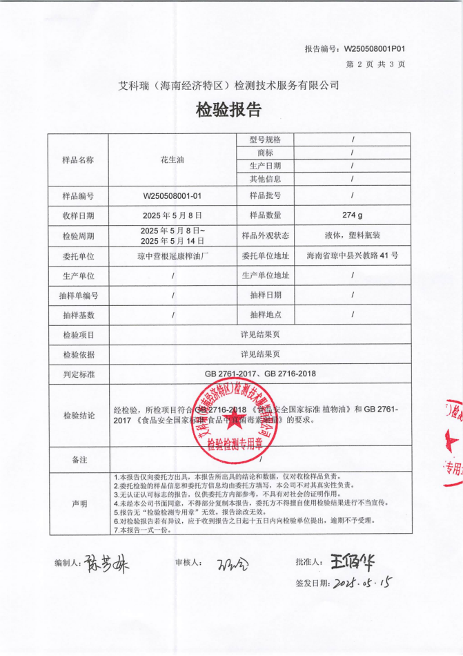该产品以琼中本地小种花生为原料经过悉心筛选后,通过智能化生产线压榨而成,无添加,健康,每年都做检测,合格上市,有多种规格,适合煎炒烹炸等各种烹饪方式。