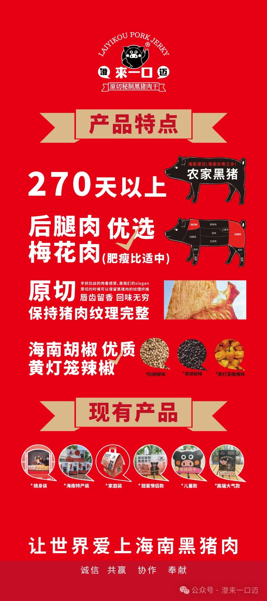 “澄来一口迈”黑猪肉干聚焦以海南农家黑猪肉为原料加工的零食赛道,目前公司已围绕黑猪肉干完成三大系列产品:1.随身装,2.海南特产装,3.高端伴手礼装。 1.选用海南澄迈(海南长寿之乡)270天以上的农家黑猪,只选择后腿肉与梅花肉作为用料(肥瘦比适中),原切保持肌肉纹理完整,配料选自海南优质胡椒、黄灯笼辣椒等。2.手抓拉丝的肉香感受,这是我们的slogan,就是原切的时候保留了黑猪肉的纹理纤维,手抓拉丝咀嚼开就有满满的肉香感,让人唇齿留香、回味无穷.