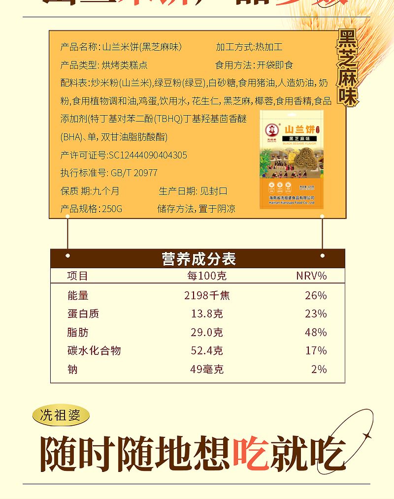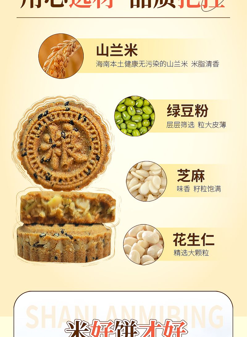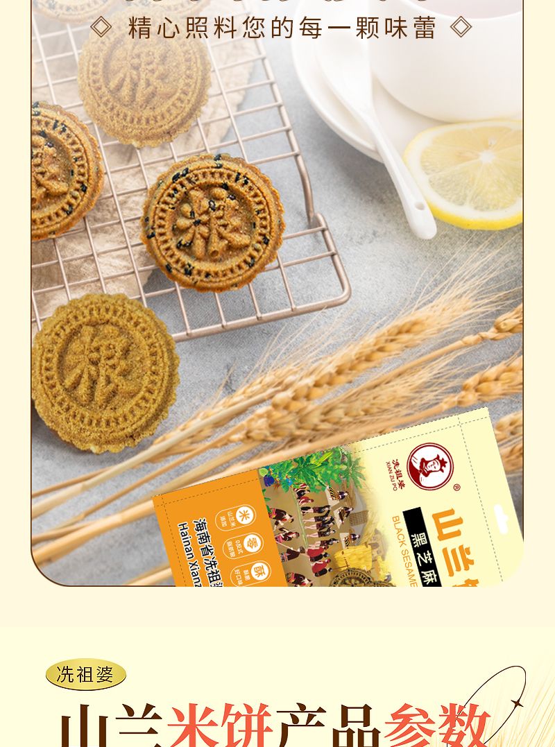 选用海南黎族特有的山兰稻米为原料,搭配黑芝麻、花生仁、椰蓉等丰富配料,经传统工艺烘烤而成。饼体薄脆香酥,米香与芝麻、椰香交织融合,入口即化,带着浓郁的热带海岛气息。