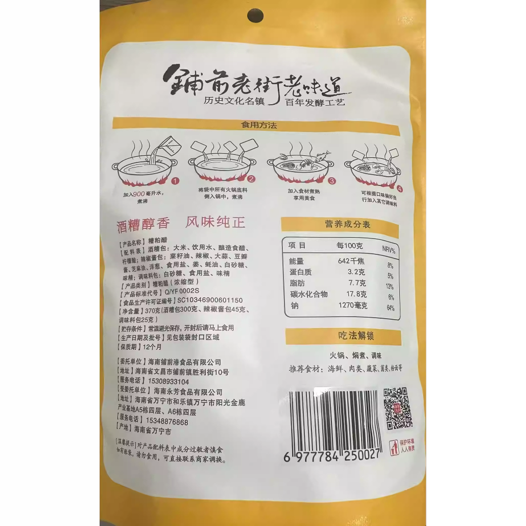 「文昌」海岛糟粕醋酸辣味海鲜火锅底料微微辣小家庭装370g海南调味汤底